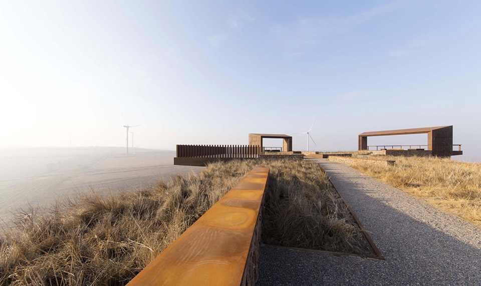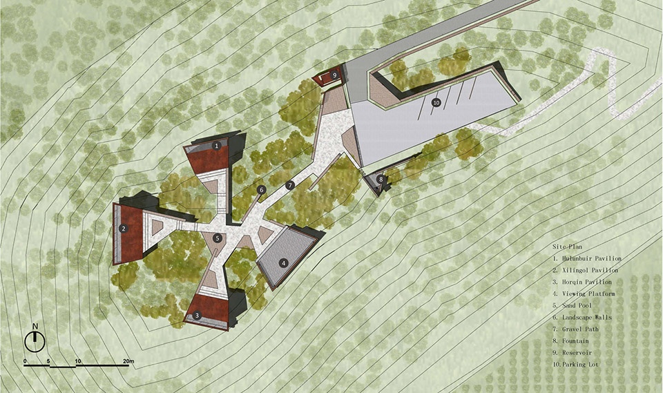 The overall landscape architecture was designed with a radial concentric shape consisting of three semi-open viewing pavilions and one fully open overlook. The geometry of the park was inspired by the leaf structure of the yellowhorn tree, a plant species that has been instrumental in reversing the area’s desertification and promoting local economic prosperity. The three semi-open viewing pavilions positioned in different directions represent the other three historical campaigns waged against desertification on the Mongolian Plateau: Hulunbuir grassland (to the north), Xilingol grassland (to the west), and Horqin grassland (to the south). Together, these features serve as an historical place epitomizing the natural and historical practice of reversing the desertification of the Mongolian Plateau.