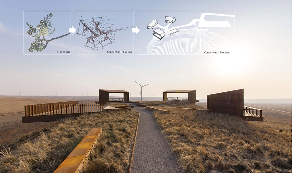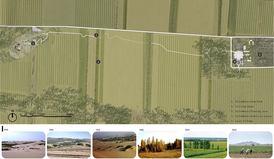 Yellowhorn is a native species that thrives in harsh desert climates, stabilizes soil, retains moisture, and provides oil-rich seeds. At this project site today, the yellowhorn farm spans 150 acres and has begun to attract immigration and boost the local economy. This farmland has been also integrated within a greater wind energy program supplying renewable energy for both farmlands and local villages. The project was initiated by the Yellowhorn Exhibition Center and Aohan County government in 2013. The concept is to commemorate the work that has been done to combat desertification on the Mongolian plateau, exemplify the transformation from desert to commercially viable farmland, and promote the vitality of local villages through the landscape. A series of public meetings with local governments, communities, village residents, farm employees, and scientists in the agriculture, geology, ecology, and humanities fields gave this project a true sense of place that connects it with the heritage, spirit, and attitude of those battling desertification.