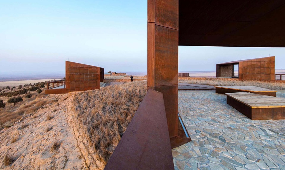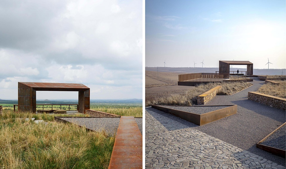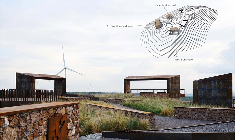▲观景亭设计理念:三个观景亭被设置在不同的方向,分别代表了蒙古高原上其他三个具有历史意义的荒漠化治理地区:呼伦贝尔草原(朝北)、锡林郭勒草原(朝西)以及科尔沁草原(朝南)。Concept of Viewing Pavilion Design: The three semi-open viewing pavilions positioned in different directions represent the other three historical campaigns waged against desertification on the Mongolian Plateau: Hulunbuir grassland (to the north), Xilingol grassland (to the west), and Horqin grassland (to the south).