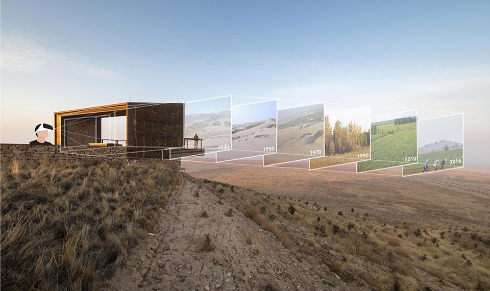 “中国内蒙古的肥沃草原曾一度因为过度的放牧、伐木、扩大农场、人口压力、风力和干旱而饱受荒漠化的侵扰。在过去的20年间,依靠地方和国家的帮助,约有300万英亩的荒地得到了恢复。为了纪念几代人为荒漠化防治所付出的努力,一座具有教育意义的公园和观景平台被建造在广阔的文冠庄园顶端。设计师利用当地的材料、植物和方法搭建了一系列简洁而美观的结构,以框架的形式凸显出重获新生的自然景观,并借助增强现实向人们讲述了这一值得铭记的变革故事。”