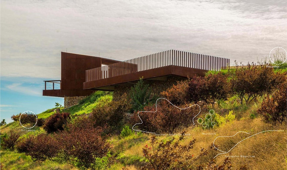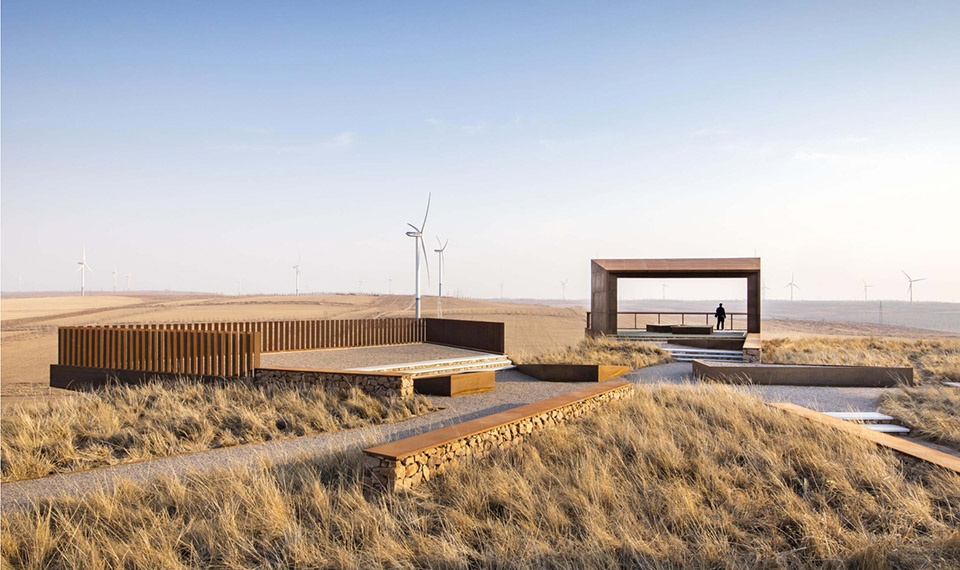 The Yellowhorn Farm Park project, built in 2014, is a 150-acre hilltop of yellowhorn farmland located in Aohan County in Inner Mongolia, China. Inner Mongolia is China’s third largest province, and has been battling severe desertification for over a century. Over-grazing, logging, expanding farms, population pressure, wind, and drought have all turned this once-fertile grassland into sandy a plain. In the past 20 years, approximately three million acres of desert have been rehabilitated through enormous local and national effort. This project site is one of the most representative fields of this type of transformation, from severe desert to flourishing farm. The particular location of the overlook platform of this park was an onsite temporary office, during those years of fighting desertification, serving as a hub, providing space for observation, organization, rest, and service to thousands of workers devoted to fighting desertification. With an intention towards minimal environmental intervention, the landscape design team integrated historical resources (i.e., materials, plants, and construction methods) with contemporary uses (i.e., education, recreation, and technology integration) to commemorate several generations of effort to combat desertification and provide ecological, recreational, educational, and economic benefit to the local area.