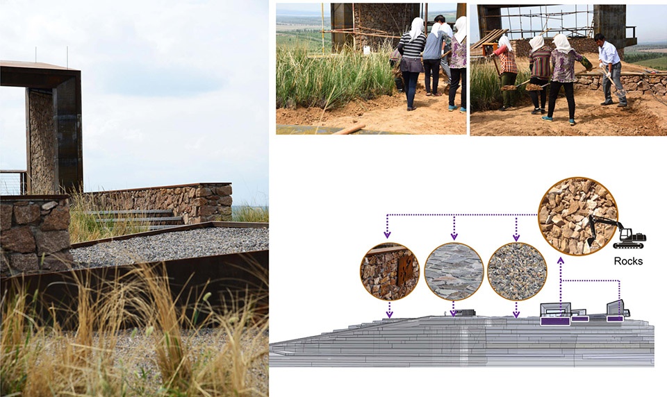 景观设计采用了从当地挖掘的岩石、泥土、废弃的机械部件以及天然的本地植物;这些元素被重新利用到新建的景观结构和道路当中。原先被用来种植文冠果的机械部件和从当地开采的天然石材共同为景观增添了历史性的特征。为了在寒冷、干燥且多风的气候下塑造具有高度适应能力的景观,团队参考了当地耐旱房屋的建造方法,采用砾石、夯土和天然石材来搭建结构,并在其周围和内部种植沙棘、芒草和文冠果等本地植物。为期六个月的建造过程并无专业建筑团队的参与,而是完全依赖于当地的资源和村民。