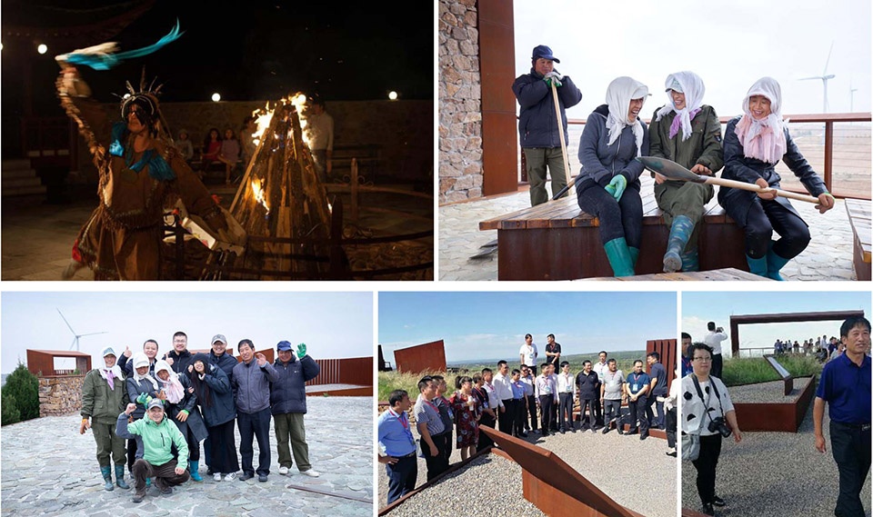 The basic functions of the landscape structure include memorial, recreation, education, photography, nature watching, resting, and village events. The distribution of open spaces, public stages, social places, and amenities reflect the mobility, flexibility, and cultural interaction that define this contemporary use and certain traditional cultural activities, such as Mongolian dancing and singing. Also, some specifically designed display structures with traditional signs and patterns were integrated into the open spaces for potential exhibition, memorial, and educational events. The routine programs held in this landscaped area, part of the Yellowhorn Exhibition Center, involve national summit meetings of yellowhorn businesses, classes and summer camps for regional schools, and a great quantity of public visitors.
