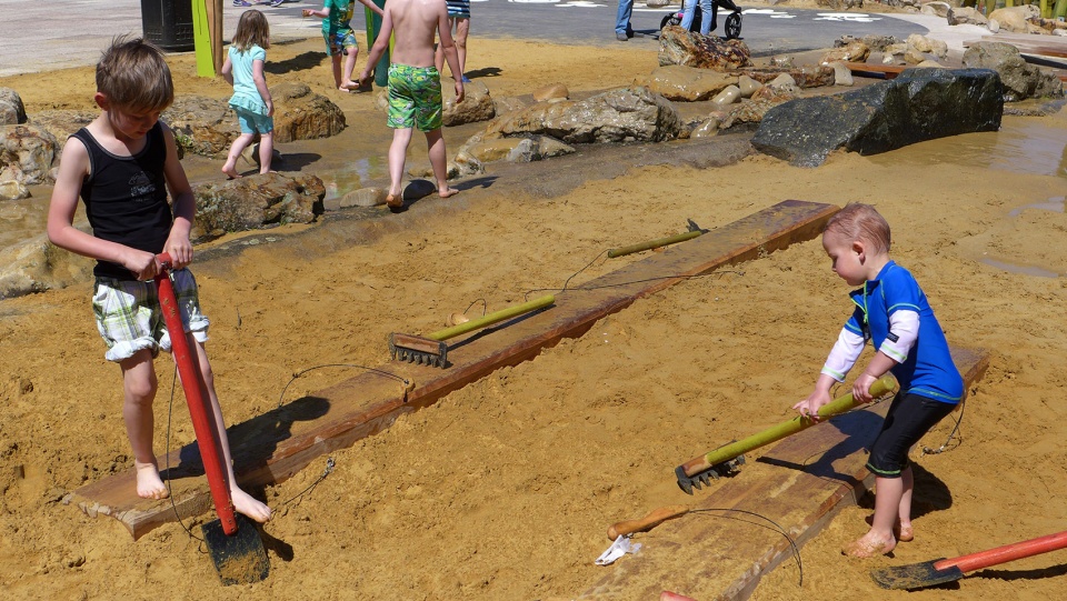 除了造型跷跷板,场地内还提供了让孩子们真正自己动手“务农”的机会。用橡胶代替金属制作而成的迷你农具,符合孩童的身体维度,保证使用安全。让孩子们能在沙地玩耍中逐渐熟悉农耕工具。