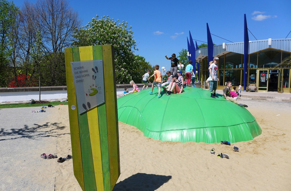 埋在沙地中的充气蹦床模拟了刚种下的饱满种子。蹦床运动既增强体力又锻炼平衡能力。在上面跳跃的孩子们也正像萌芽的种子一样充满活力。