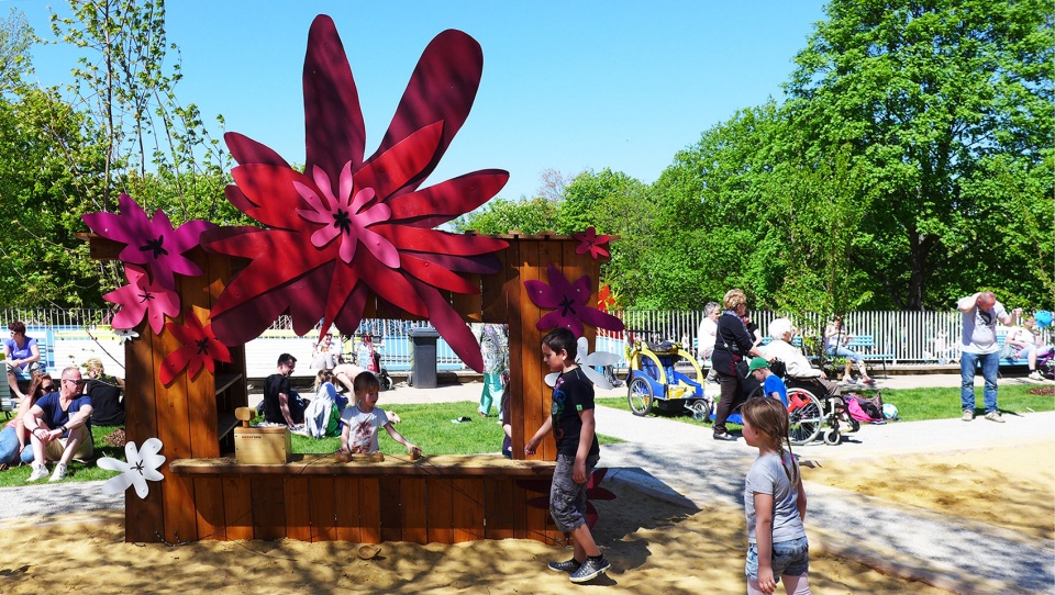 “耕地”上立着一个巨大的花壶,壶身上插着可伸缩的水管。摇动后方的杠杆,壶嘴会喷出水柱,壶身上的水管可被孩子们当作玩耍用的水枪。