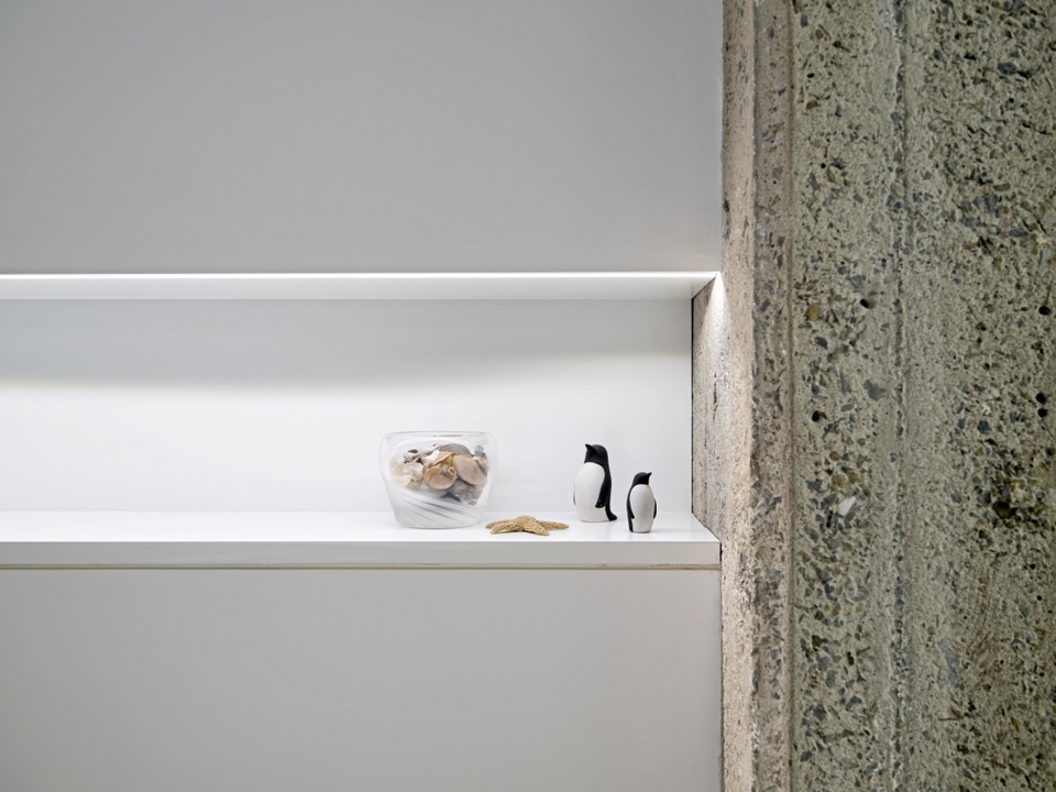 走廊空间的一侧排列着定制的白色置物架,为公寓提供了储藏和展览空间,不仅能够使室内空间有条不紊,更能够突出Loft公寓内的纵深感和空间。墨菲隐壁床折入墙上的柜子内,当有客人来访留宿的时候,就可以将床拉出。走廊式空间的另一侧则是包含了主卧套房和化妆间的私人空间,通过磨砂玻璃推拉门与走廊分隔开来,门上覆有水平的铝制板条。该推拉门能够提供最大的灵活性,并与白色储藏空间的简单线条形成简洁的对比。浴室的天花板中央设有一个狭长的灯带,该灯带顺着浴室的长边方向设置,一直延伸到与天花板相接的墙壁上。在走廊的尽头,空间通向一个配有白色橱柜和台面的开放式厨房和一个小型的起居空间。楼顶设有共享平台,能够为该建筑内的住户提供社交空间。