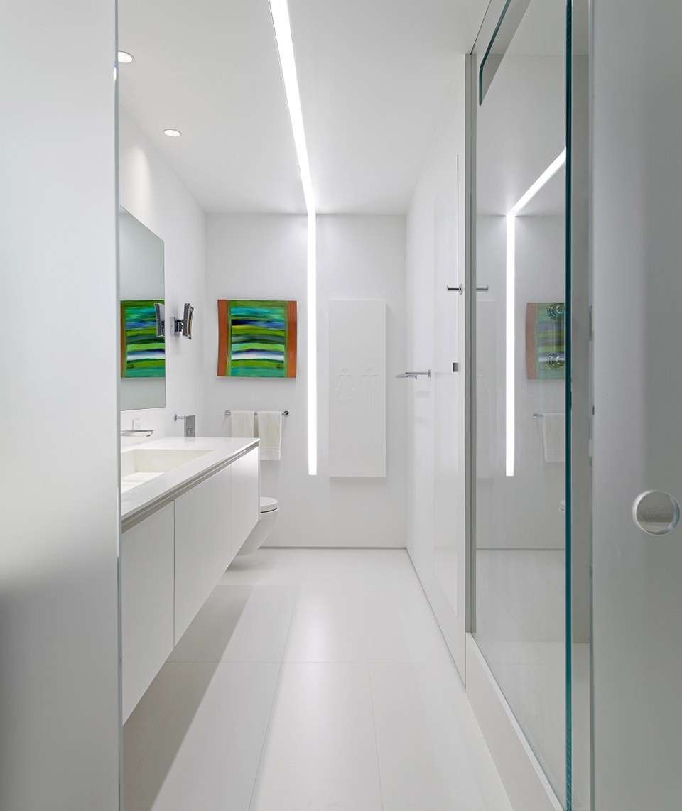 ▼浴室,天花板中央设有狭长灯带,一直延伸到墙壁上,the bathroom with a narrow strip of light at the central ceiling that runs down onto the wall