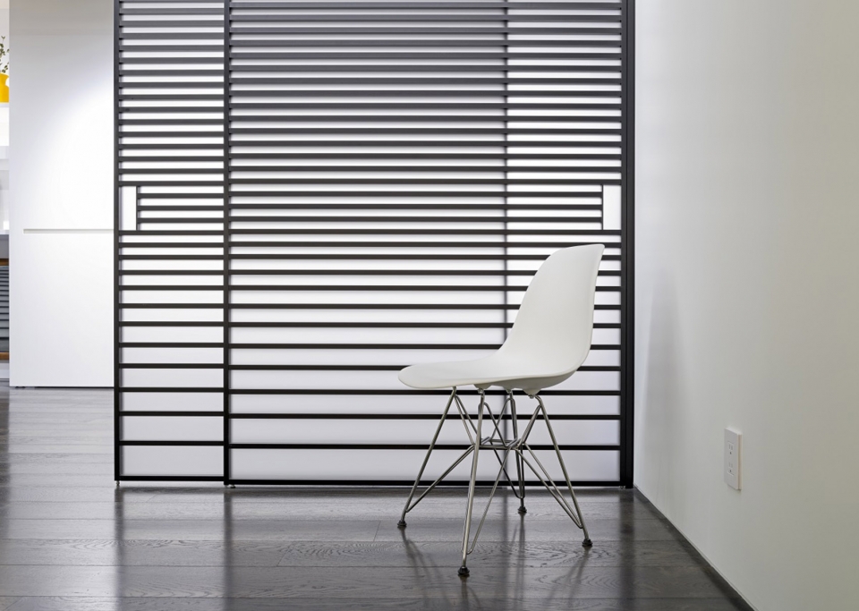 ▼推拉门细节,磨砂玻璃推拉门上覆有水平铝制板条,details of the sliding doors, horizontal-slatted aluminum is attached on frosted-glass sliding doors