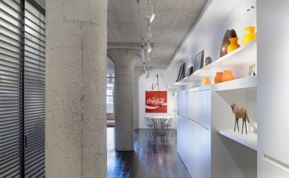 二街Loft公寓现在的住户被该建筑的仓库氛围和其丰富的工业历史所吸引。然而,该空间曾经的平面却不甚合理:长80英尺、宽20英尺的狭长空间内充满了各种无法使用的夹角。尽管如此,住户还是看到了这个1,765平方英尺的空间的潜力。因此,建筑师决定,首先将平面中的夹角全部移除,以创建一个更加合理的建筑平面,从而使得阳光能够透过最大的窗户照进室内,让整个室内空间都充满自然光线。“我们的设计概念是在这个较为狭窄的空间内创造出一种简约、现代和开放的空间体验,”本项目的建筑师Stephen Stept提到。“我们将整个Loft公寓划分成了两个长空间区域,一个是宜居的走廊式空间,它将住户的活动与室内流线很好地结合在了一起,另一个则是一个封闭空间,它容纳了各种私密功能空间。”室内的色调简洁而干净;所有的内置构件都是白色的,辅以混凝土柱子和外露的混凝土天花板,深色的木地板则在视觉上强调了整个空间。