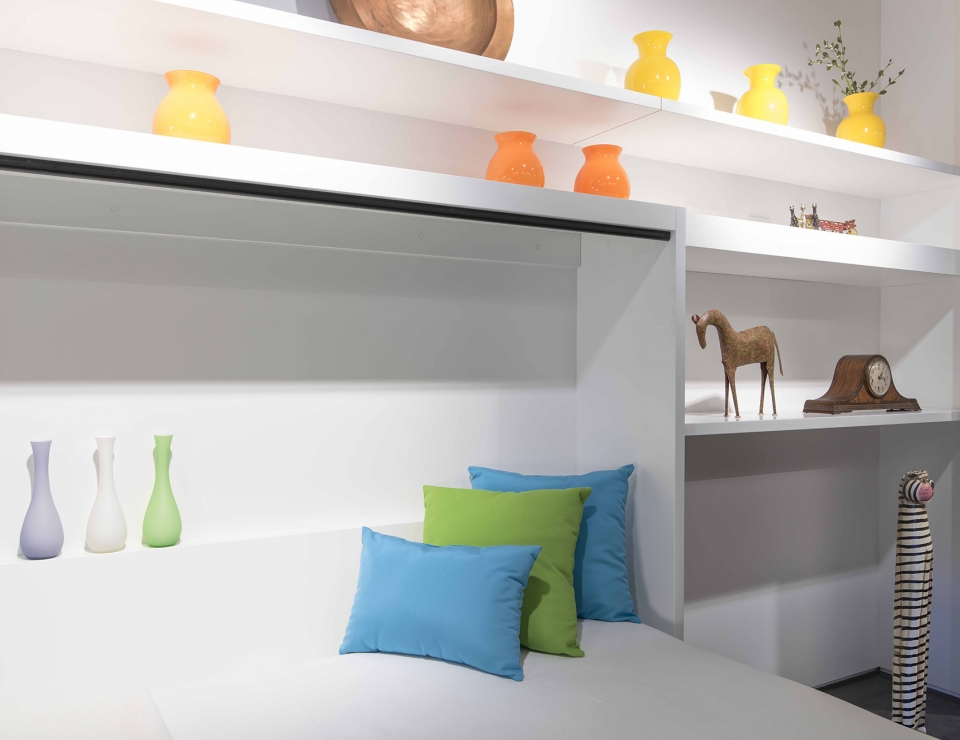 ▼墨菲隐壁床空间和白色置物架细节,details of the Murphy bed and the white shelving