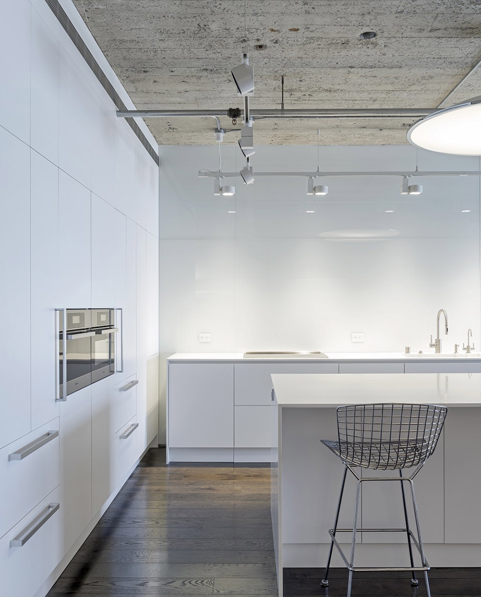 Custom, white shelving lines one side of the hallway to provide storage and display space—and keep clutter at bay—while accentuating the length and sense of space within the loft. A Murphy bed folds out of the wall for when guests stay over. The other side of the hallway holds private spaces and is defined by horizontal-slatted aluminum and frosted-glass sliding doors, which hide the master suite and a powder room. The sliding doors provide maximum flexibility and serve as an elegant contrasting detail to the simple lines of the white storage component. The bathroom is lit by a narrow strip of light that runs the length of the bathroom and down onto the wall. At the end of the hallway, the space opens up into an open-style kitchen featuring white cabinetry and countertops, and a small living area. A shared rooftop deck provides social space for the building occupants.