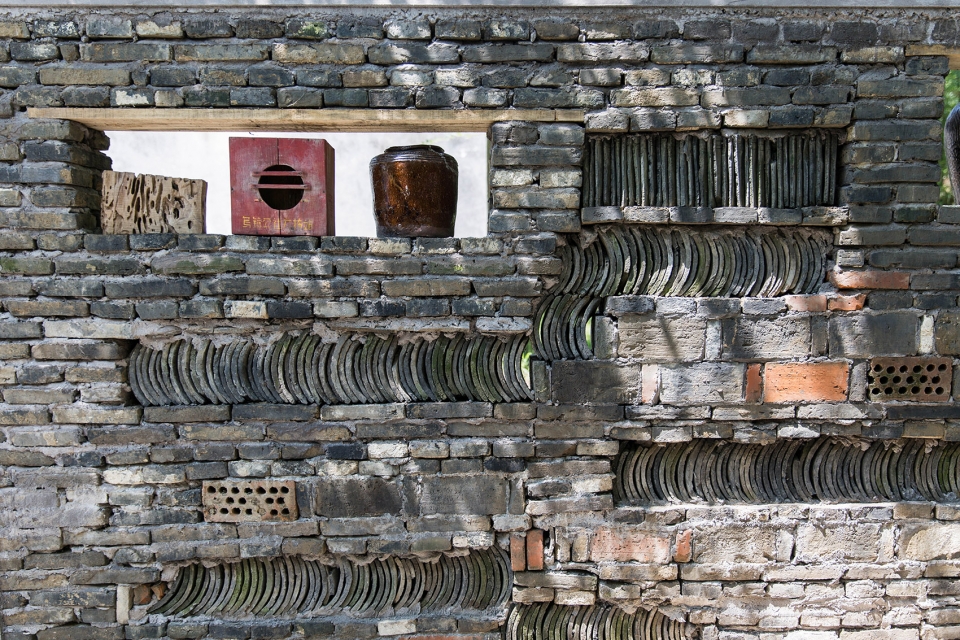 “横港村有很长的历史,村中老人又都念旧,保存了许多“老物件”。我们在庭院较为“开放”的前院中,做了三面景墙。在墙面框景镂空处,放置了精心收集到的“古董”。“古董”们的出产日期也被雕刻在了墙身上,印证了场地的过往岁月。”