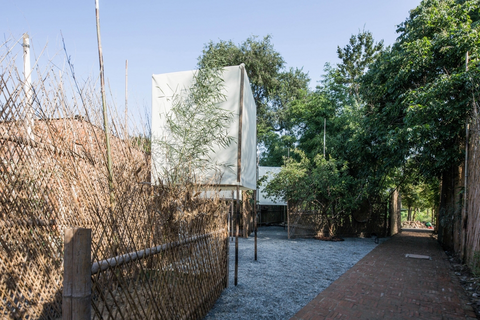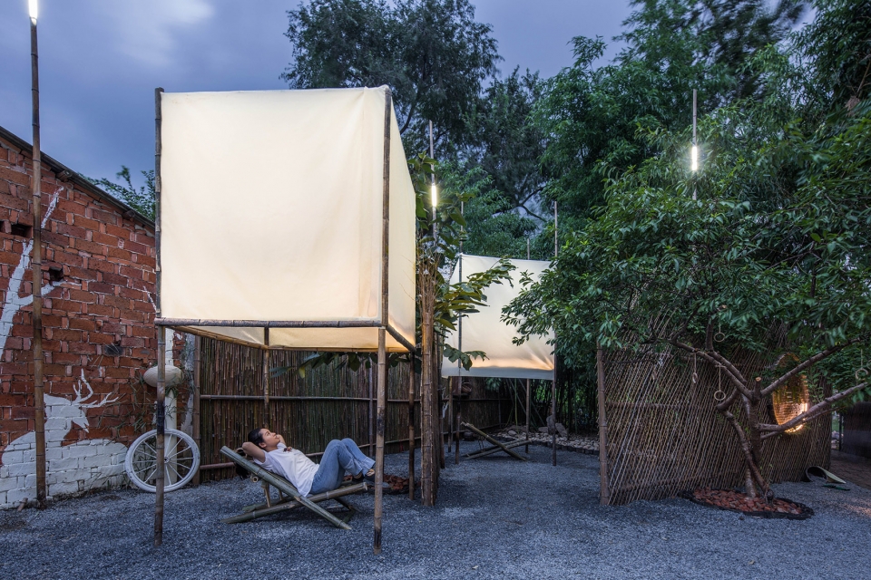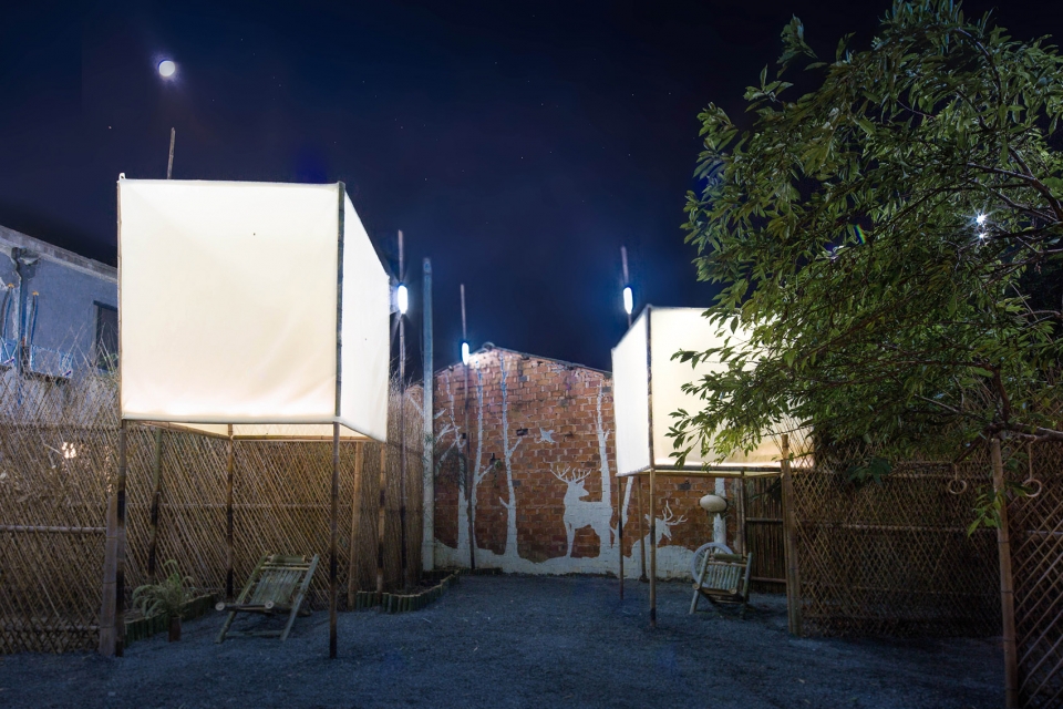 Bamboo was used as the basic material to construct the frame of starring-sky box. But what was to be the ideal material for the façades of the box? According to designers: a. the material should be semi-transparent to make the built-in lighting available outside as a floating lantern in the tranquil idyllic night; b. it should be easily constructed due to the lack of cost and labors; c. visual aesthetics is necessary to enhance the landscape value; d. durability should be included. As mentioned above, a semi-transparent durable nonwoven curtain fabric was selected to be the material for facades of the box, creating a dreamy lighting effect at night.