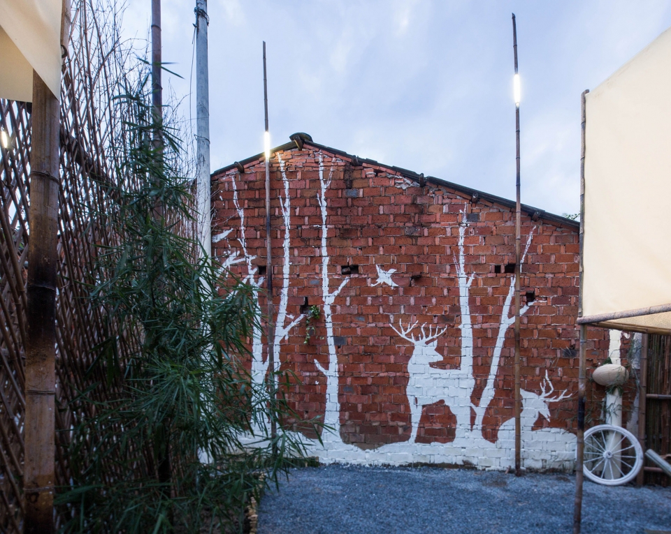 设计师在民宿红砖墙上,绘上母子鹿的墙绘,增加院落整体视觉趣味性。
