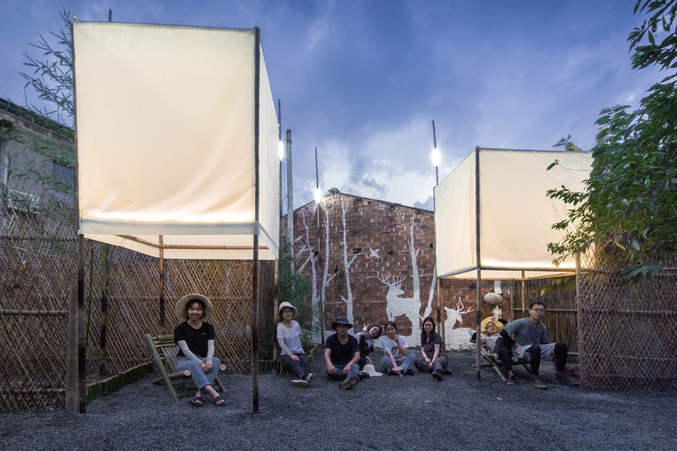 观星盒子是利用竹子作为基础框架,在框架外装置围合材料。围合材料的选择上,设计师提出了四点要求:1.有一定的透光型:能够透出内置的灯带光,在视觉上能形成漂浮灯笼的感受,增加夜晚浪漫静谧的氛围;2.易加工:在成本和人力都相对缺乏的情况下,容易加工并且出效果;3.景观性:材料本身需要一定质感,提升空间的品质;4.耐久性。在多方的考虑下,设计团队选择了半透光的无纺窗帘布。该布料有质感,能形成隐约透光的效果,易加工,并且具备较好的耐久性。