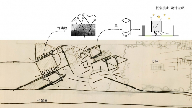 场地位于民宿的北侧,面积约有220多平米,进深7米。这是一个稀松平常的乡村角落。从后院到河边道路中间有一片17米进深的荒地,荒地旁是一小片竹林。实地考察后,横港乡建营暨奥雅集训营的设计学生决定将院落、荒地以及竹林打通,整合设计。在整合的空间中,进一步安排,增加折线形的分割墙,创造更加交互的流动空间。同时,分隔墙将院子划分成两部分,开放的公共庭院和内部的私密空间,满足住客多维度的需求。设计师还在院中设计了观星盒子,增添场地的趣味性。人们可以躺在观星盒子竹椅上,仰望夜空,沉浸在这种“艺术介入乡村”的体验中。