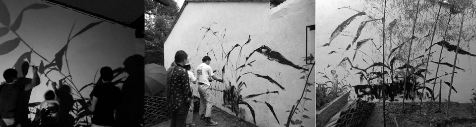 ▼设计团队将竹影绘制到墙体立面,Team painting the bamboo shadows on the façade of the lodge