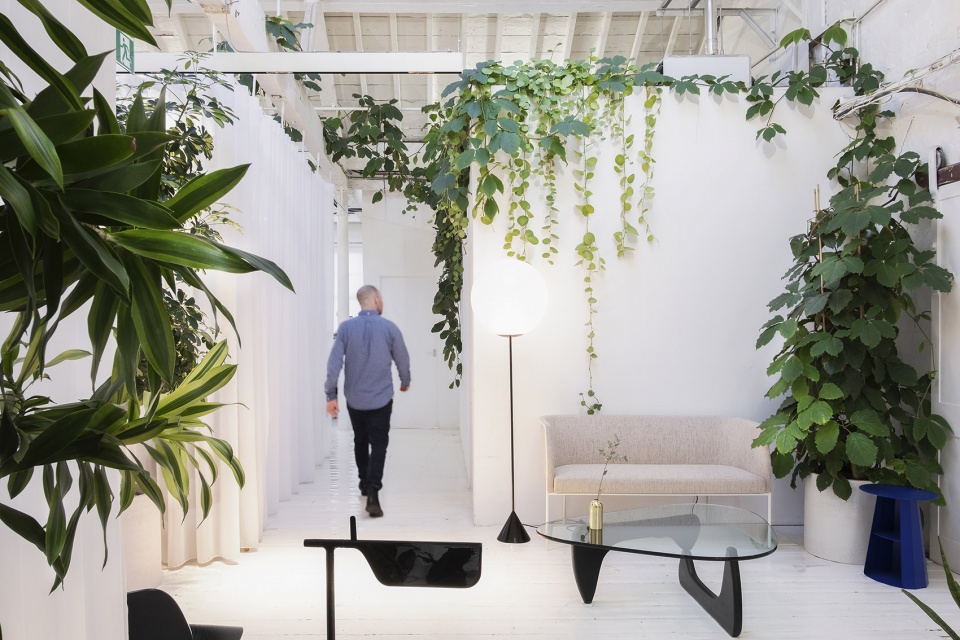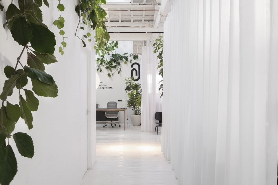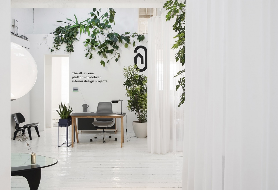 线上家具采购和规范部门占用了一间旧家具仓库的顶层工作室,使用非传统隔断来改造他们的工作空间。定制的轨道使空间得以重新配置,以适应个人工作、合作会议、大型办公活动及展览。轻快柔和的浅色调装潢凸显了空间的宽敞明亮,大量使用的绿植为工作空间带来了平静感和幸福感。