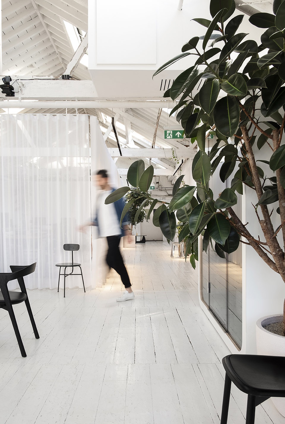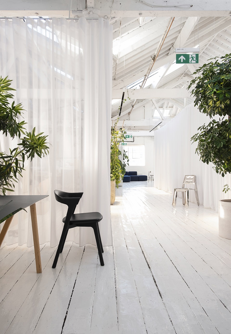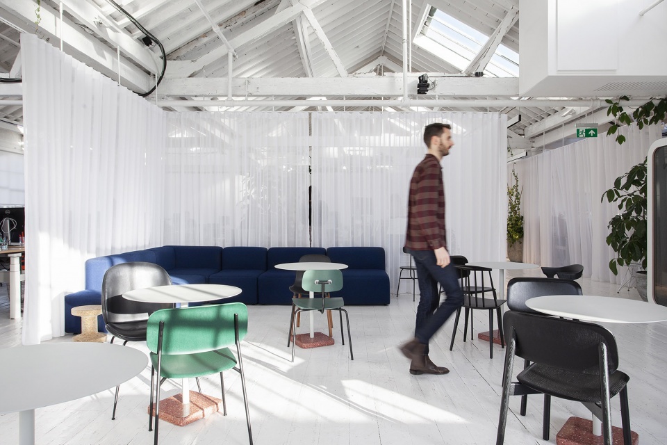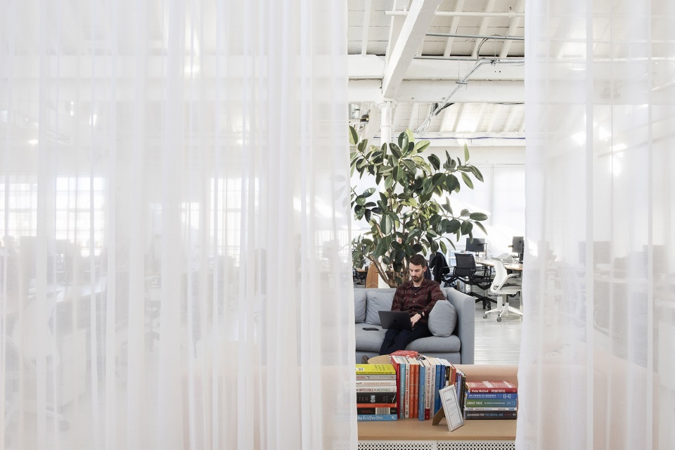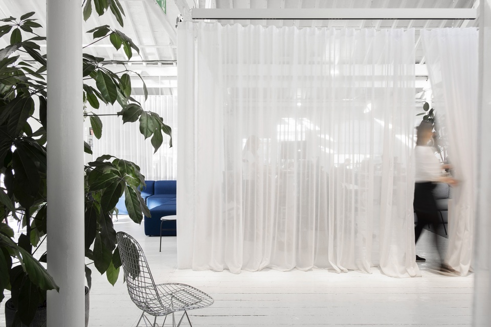 Within the large open-plan workspace of a growing tech company, a network of curtains provide Clippings with a flexible and expandable office.