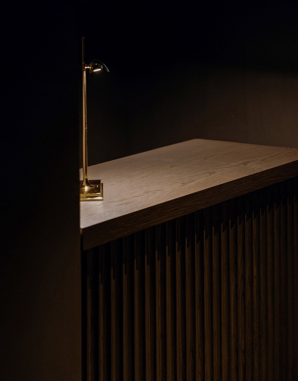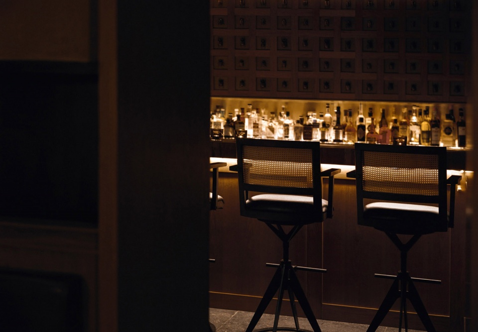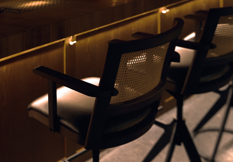 在160平米空间里,长吧台是绝对的核心。设计师运用了大量温暖的色调:缅甸柚木,天然牛皮和黄铜等材料。在12米长的缅甸柚木台面中嵌入3个600x380mm的冰块托盘,以及6个900x140mm的调酒托盘,可以满足6-8个调酒师同时工作。J.Boroski的吧台与传统酒吧的吧台有许多不同,设计师将所有调酒设备完全隐藏在吧台下方,避免使用吧台后面的柜体,保证整个调酒的过程只在吧台台面呈现。不仅如此,通过博物馆级别射灯的指引,客人可以近距离、沉浸式地观看调制鸡尾酒的全过程。酒保和客人之间因此增加了更有效的交流。温润柚木的长吧台、灯光、酒的香气以及调酒师的参与,使得整个调酒的氛围更贴心和私人化。此外,长吧台区的吧椅也是由atelier xy为这个项目量身设计,选用胡桃木实木、实心铁做氟碳喷涂搭配印度尼西亚手工编织的六角眼编材料和天然牛皮。
