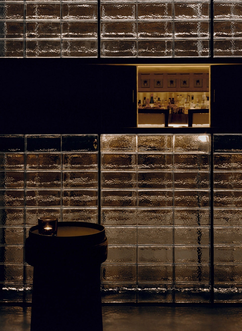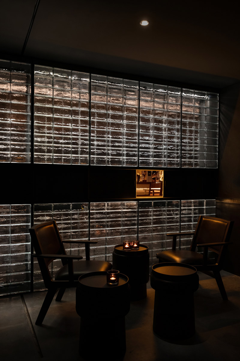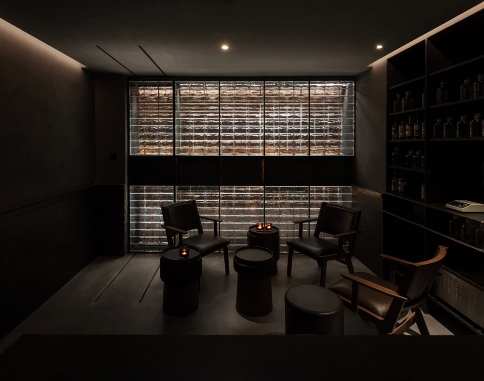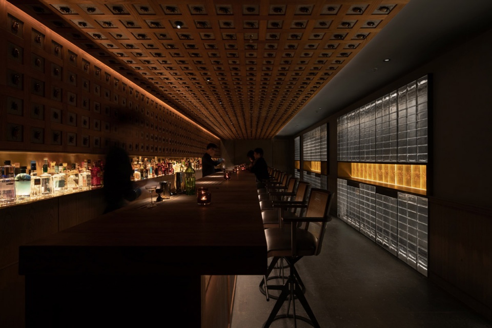 ▼吧台背面为整面玻璃砖墙,glass brick wall on the opposite side of the bar ©是然建筑摄影