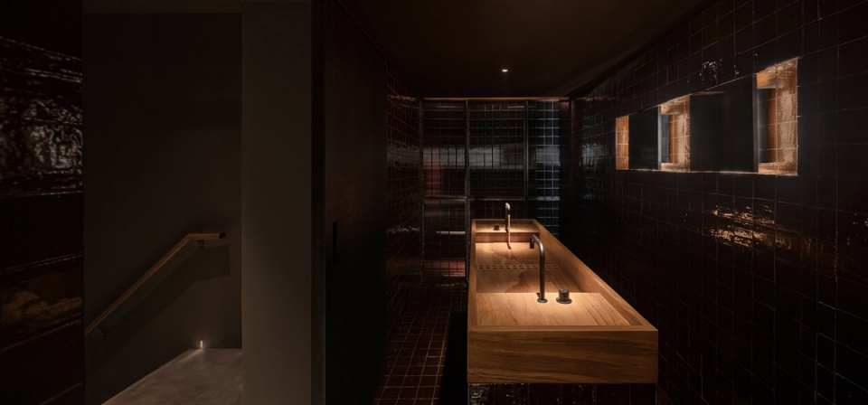 秘密酒吧的卫生间延续了整体的神秘风格,灯光昏暗,墙面和地面是深红棕色方形手工瓷砖,搭配黑色压花玻璃。选用盛夏时分蟋蟀和虫子的叫声做背景音乐,两个呼吸灯配合着闪闪烁烁,忽暗忽明。唯一被射灯照亮的是整块柚木制成的洗手台,得益于缅甸柚木防腐、防潮、防霉的特性。温润的实木台面搭配黑色水龙头,在射灯衬托下如同展厅陈列的设计品,洗手也被赋予了独特的体验。