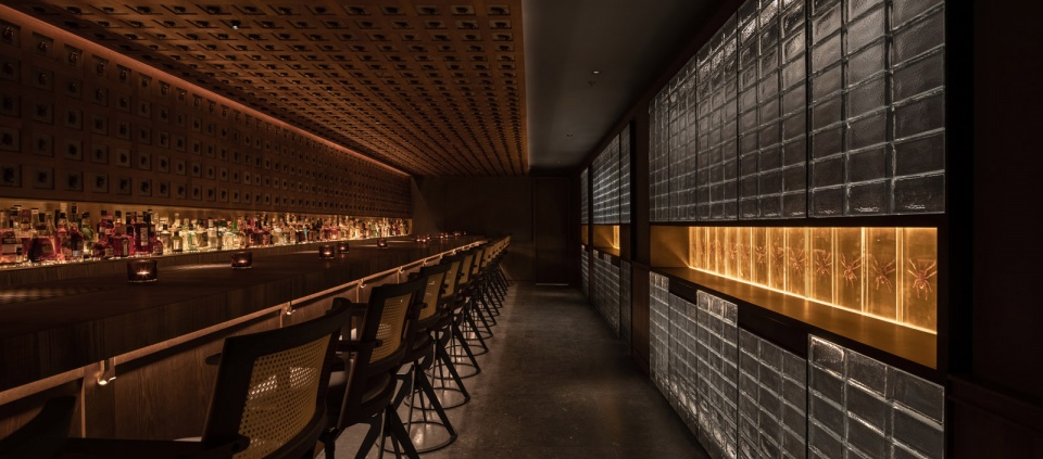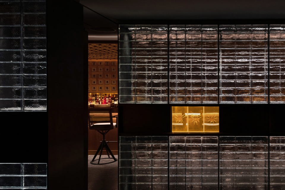 长吧台对面是一整面玻璃砖墙,将公共区域和其他相对私密的卡座和包间进行了很好的分割,在空间上起到了分割限定的关键作用。包间的入口低调地消融在玻璃砖墙上,使之形成整体。实心玻璃砖由5毫米黑色实心铁分隔组成墙体,玻璃表面呈现手工敲打的圆形凹点,在灯光的照射下折射出丰富而神秘的光。玻璃砖墙正中央镶嵌了一条由42只巨型泰国捕鸟蛛做成的树脂琥珀,与对面的甲壳虫形成一种有趣的呼应。设计师又在玻璃砖墙上嵌入几个黑铁抽屉,内部藏着其他稀有漂亮的昆虫琥珀标本:甲虫科、蜣螂科、花金龟科和臂金龟科。当客人坐在卡座喝酒时,还可以打开这几个黑铁抽屉作为小桌板使用。