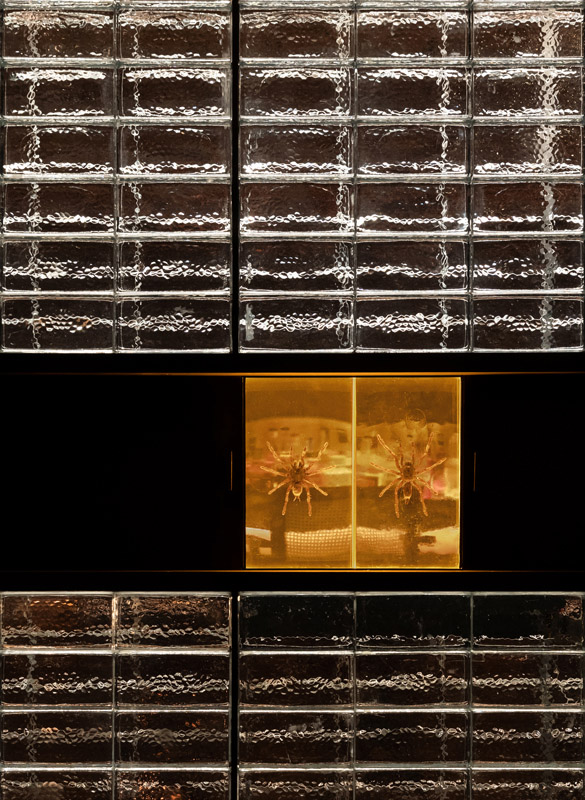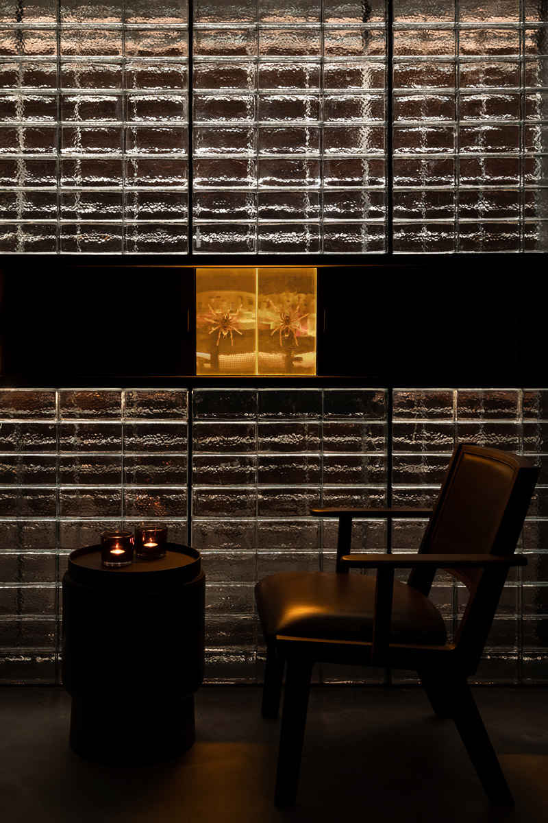 Opposite the communal bar is the glass brick wall, which acts as a multi-functional element. 5mm black iron is used for the drawers which are embedded within and when extended, several insect species are revealed. The same drawers also act as side tables for guests to put glasses on when higher occupancy is needed.