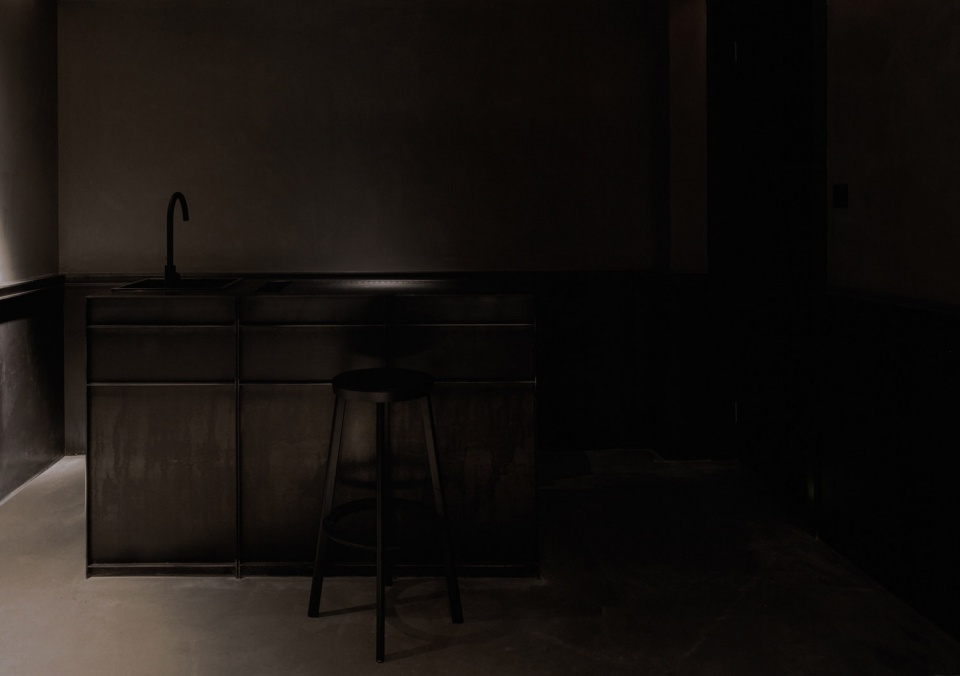 秘密酒吧里最后一个秘密空间是Joseph的鸡尾酒研发室。同样,密室入口被设计师非常巧妙的隐藏在玻璃砖墙中,需要机关才能被打开。室内使用了大量的黑色实心铁,用于墙裙、展示柜和中岛,地面是深灰色水泥自流平。展示柜上摆满用于研发分子鸡尾酒的设备,有离心机、旋转蒸馏机、均质机和冷扒机等等。墙上播放着长吧台的同步影像,以便Joseph独自研发鸡尾酒的时候,可以随时掌握外面的动态。