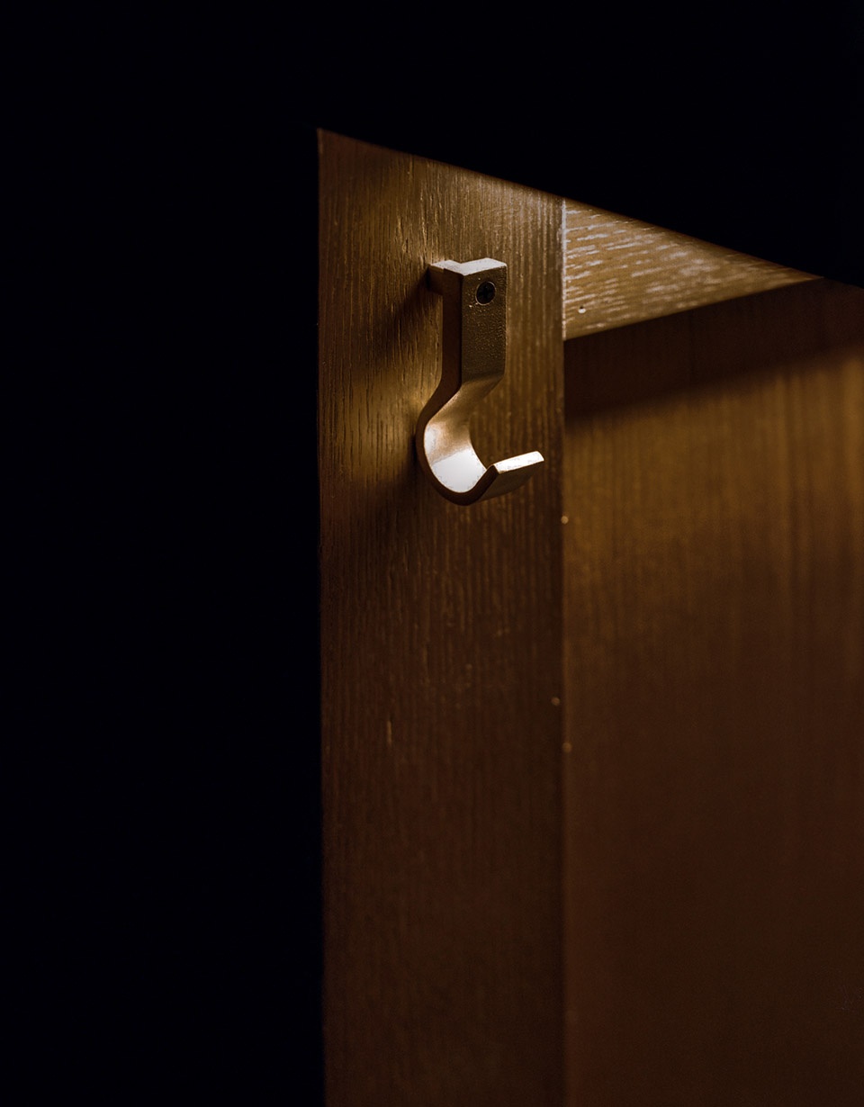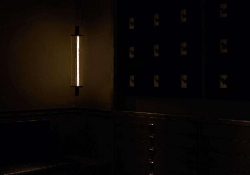 休息室沿墙面设置了长长的牛皮卡座,设计师为该项目量身设计了活动家具,这些扶手椅和圆形蹲座,以烟熏色胡桃木搭配深棕色牛皮和马毛,搭配黑色金属配件。空间以灰色橡木做旧木板和深灰色马来漆为主要材料。空间和家具整体颜色相近、富有质感、气质低调,暗调灯光和玻璃墙光影糅合成为一种奇特的、安静而神秘的氛围。休息室里最显眼的莫过于一整面满铺的蝴蝶标本墙,36个道具,每个道具里摆放一只蝴蝶,从道具底部安装极小光源照亮蝴蝶,立体感使之栩栩如生。蝴蝶标本墙下方也安放了几个长条形抽屉,完全不同科目的昆虫标本安静地趴在黑色天鹅绒上,等待被下一个好奇的人发现。