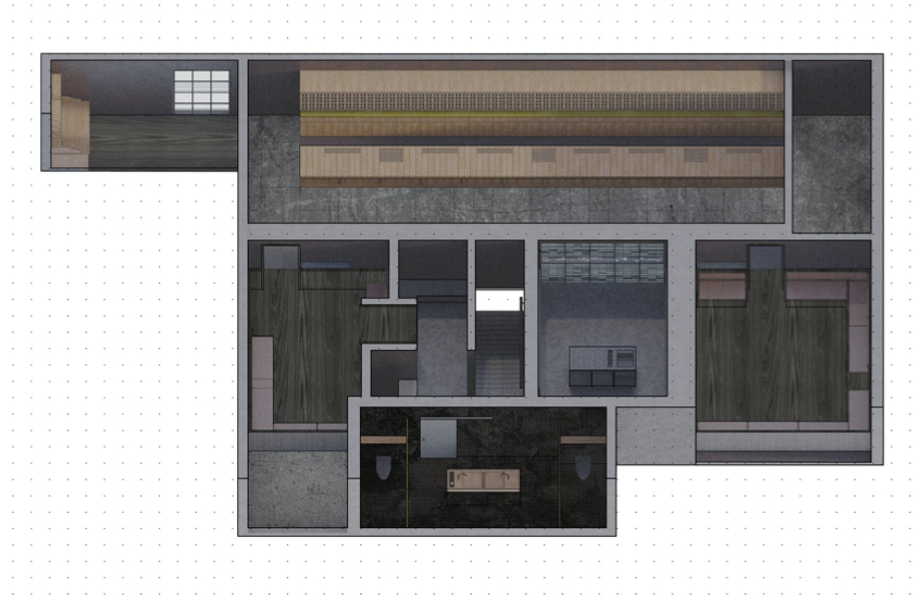 The Chamber Room acts as a laboratory for bar tenders. Entry to this space is through a heavy sliding glass brick door with floor and ceiling tracks. The heavy push required further signifies the unique character of this space. Various tools (centrifuges, rotary distillation machines, homogenizers, etc) within the cabinetry allow bartenders to hone their skills and perform their experiments in front of guests. The room also offers a projecting view of the communal bar countertop in order to provide VIP guests a glimpse of activities there.