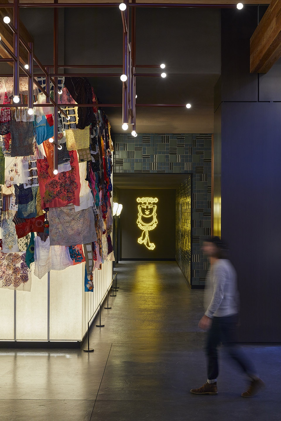 京都Ace酒店的一大特色体现在由日本和美国匠人们创作的一系列艺术作品和定制家具,其中包括悬挂在接待台的、由鹿儿岛艺术家团体Shobu Gakuen创作的大型编织艺术品;画廊空间和酒吧内铺设着Shigaraki设计的立体瓷砖;以及由著名艺术家Samiro Yunoki设计的Noren幕帘和装饰横幅等等(酒店的标识和字体也由其设计)。客房采用了智能化的设计,同时结合了Ace酒店的标志性元素、当地的天然材料、定制的Pendleton羊毛床毯以及由Samiro Yunoki原创的室内艺术作品。