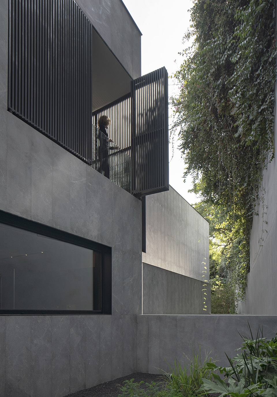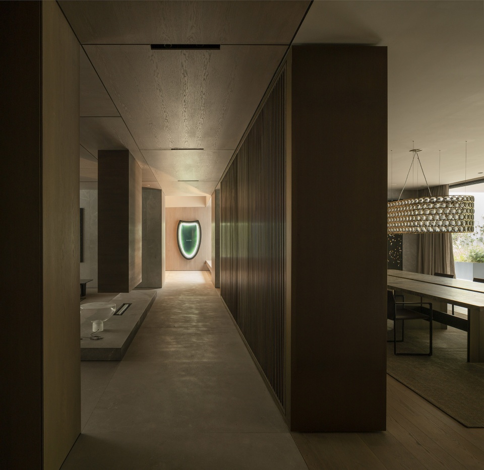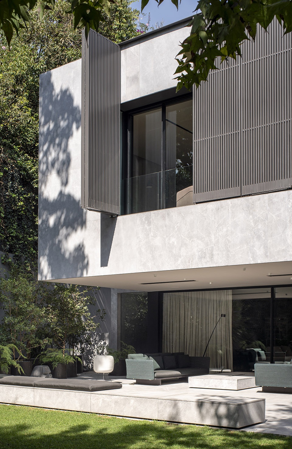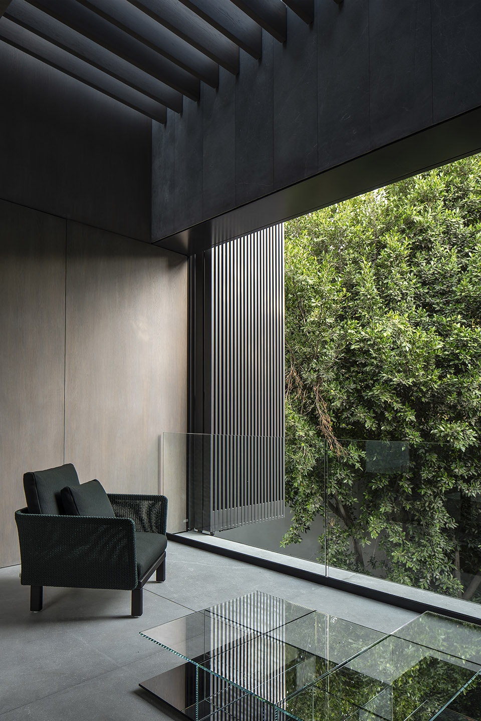在住宅的前侧,一个被茂密的植被所包围的露台营造出一种静谧的氛围,为住户创造出一个有意义的开放空间。水池不仅营造出一种迎接的氛围,更能够平衡空间,将固体存在与液体存在联系了起来。中性色调的灰色天然石材立面上镶嵌着由铝板条组成的百叶窗,不仅能够起到过滤和控制光线的效果,更能保护住户的隐私。住宅的后侧空间较为凉爽和隐蔽,两个升高的庭院中放置着一系列雕塑作品,并通过一个小花园与室内厨房联系起来。