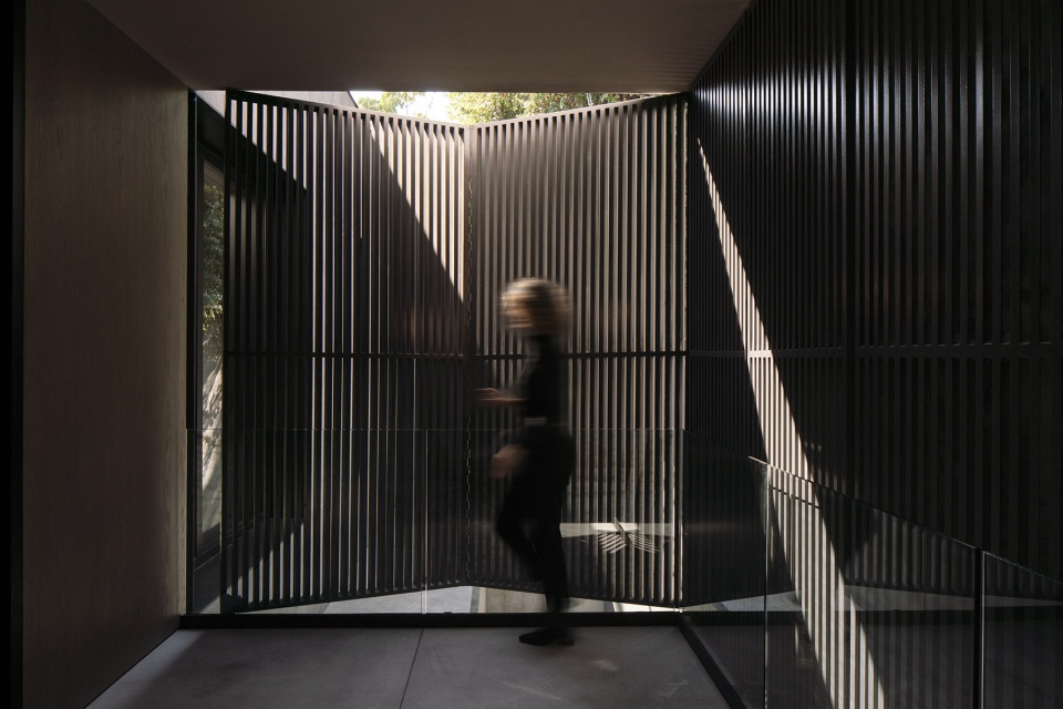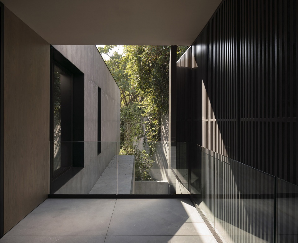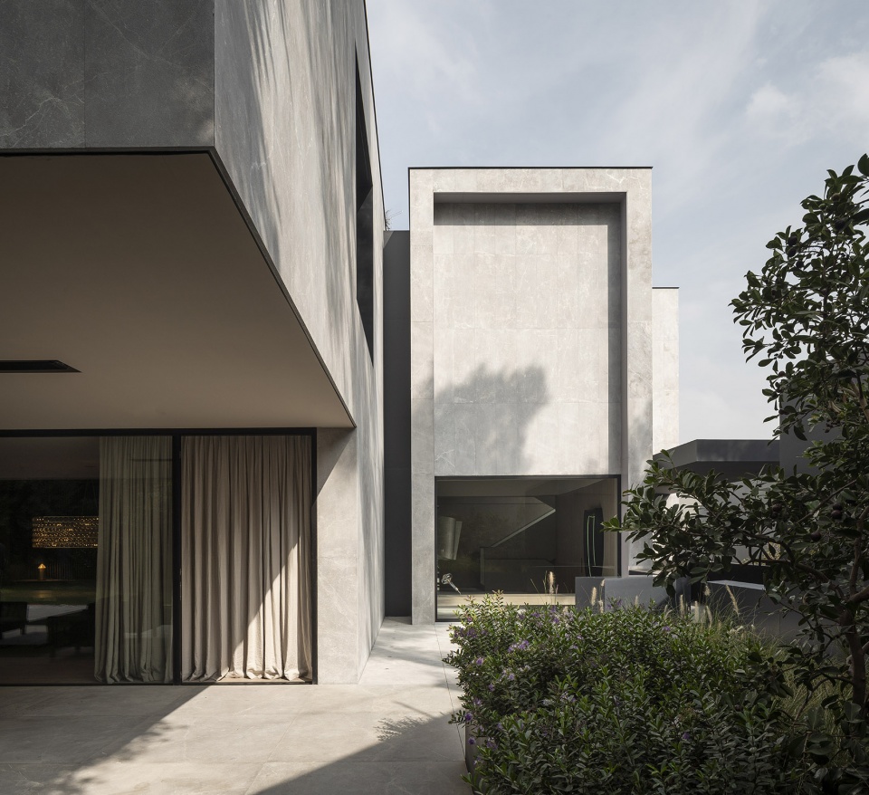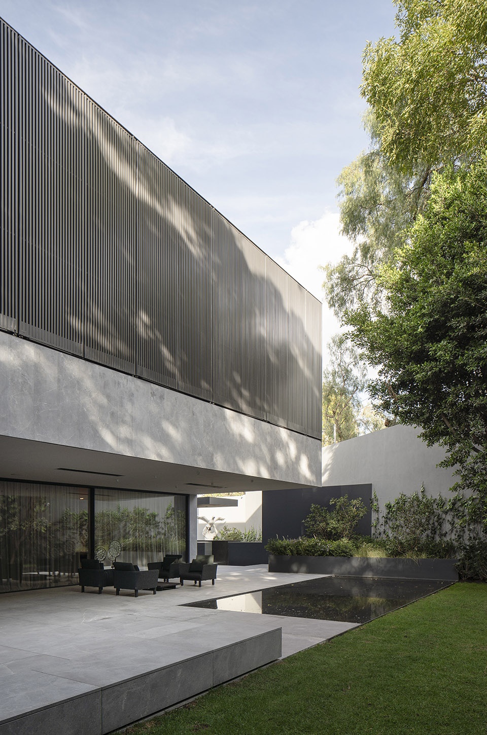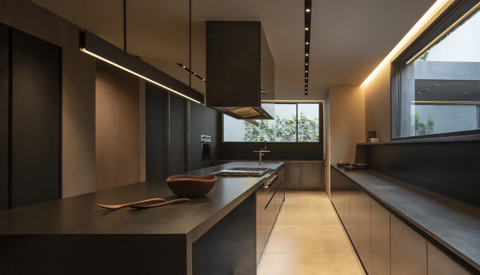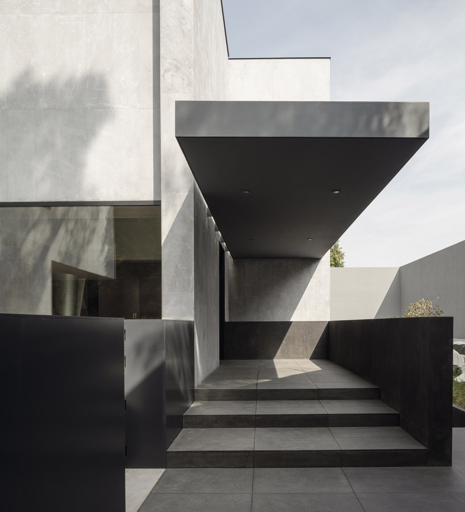 在住宅的前侧,一个被茂密的植被所包围的露台营造出一种静谧的氛围,为住户创造出一个有意义的开放空间。水池不仅营造出一种迎接的氛围,更能够平衡空间,将固体存在与液体存在联系了起来。中性色调的灰色天然石材立面上镶嵌着由铝板条组成的百叶窗,不仅能够起到过滤和控制光线的效果,更能保护住户的隐私。住宅的后侧空间较为凉爽和隐蔽,两个升高的庭院中放置着一系列雕塑作品,并通过一个小花园与室内厨房联系起来。