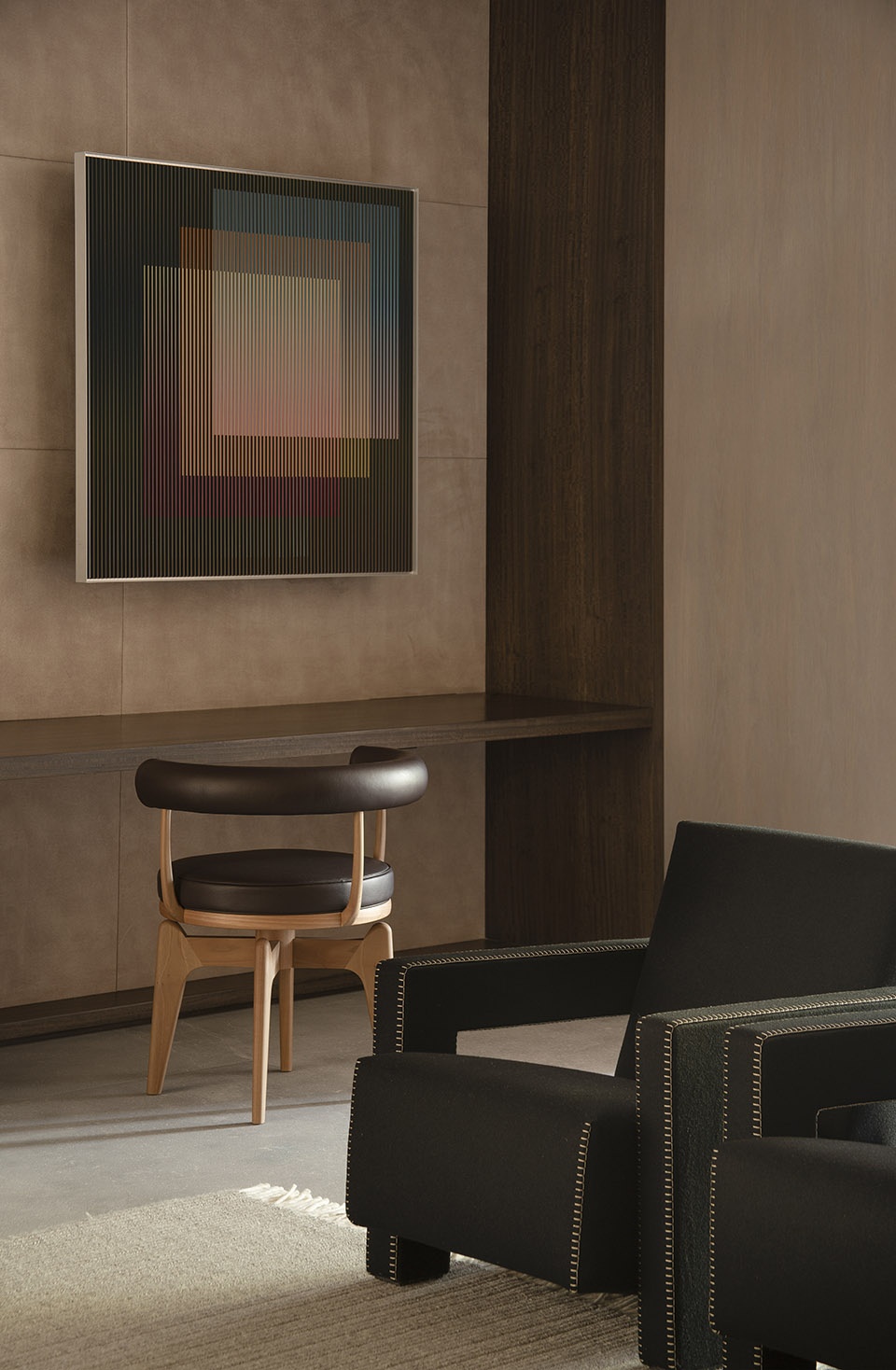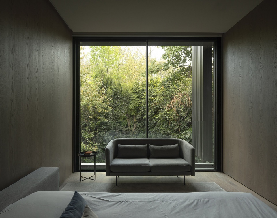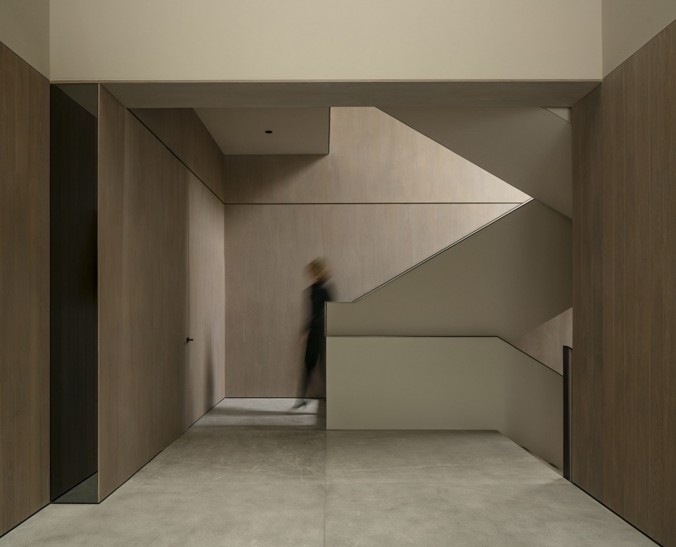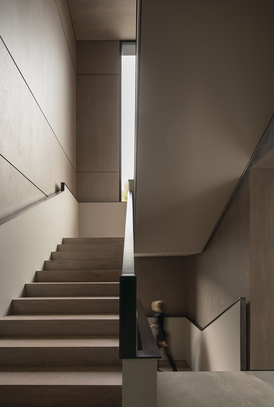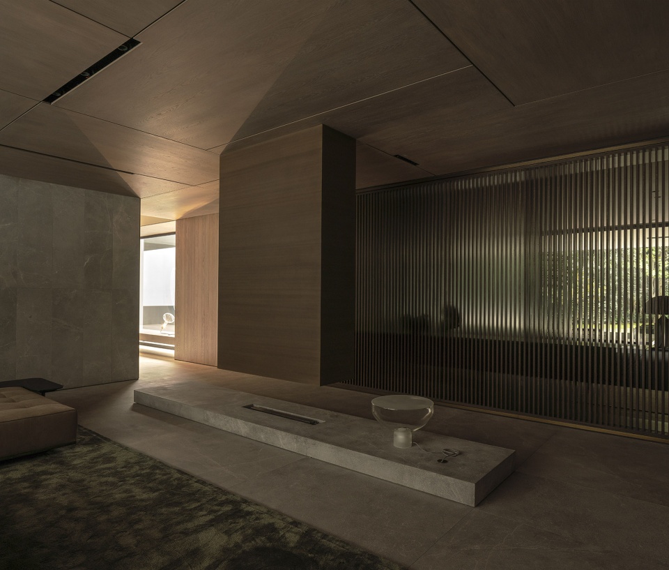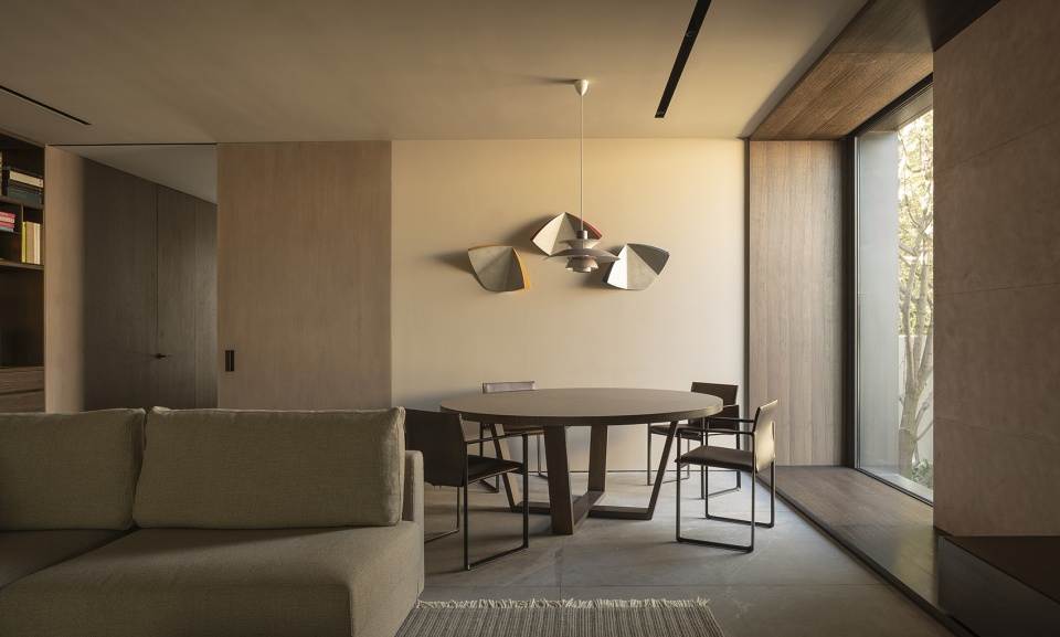 住宅的氛围营造也要依赖家具。Cassina的标志性设计与定制家具和Viabizzuno的装饰性照明系统融合在一起,打造出一个舒适的居住环境。随后,从起居室的天花板开始向下延伸的硫化黄铜壁炉又为室内平添了些许暖意。所有的空间元素组织在一起,带给住户一种亲密的、极具安全感的空间体验。
