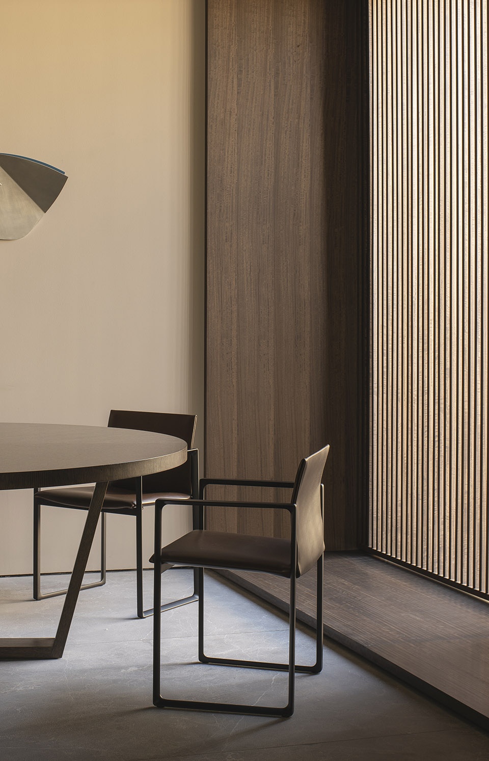 The emotional quality of the house also comes from the furniture. Cassina’s iconic designs fusion with custom-made furniture and Viabizzuno’s decorative lighting such as the Da Ma lamp or the N55 system sheds sensory light in the common rooms. Finally, the design of a sulfurized brass fireplace, which descends from the ceiling of one of the living rooms, support the warm language of the interior. One more call to the senses, to the feeling of intimacy and refuge.