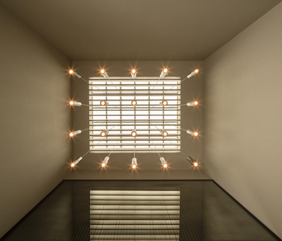 Divided into two main volumes, the first houses the only staircase with access to the three floors which is defined by a solid design integrated into space itself. With almost no visual distractions, neither of form nor of materials, the upper metallic of the railing represents very well the constant aim of the studio to emphasize the details, while a slight separation of the walls of the building makes this element a stage in itself. He is accompanied on the way by the hall that opens to the outside through a large window beside a bank and two pieces of art by Iván Navarro and David Rodríguez Caballero. The design of the space invites looking up where a large number of lamps, suspended from a skylight, strengthen the double-height.