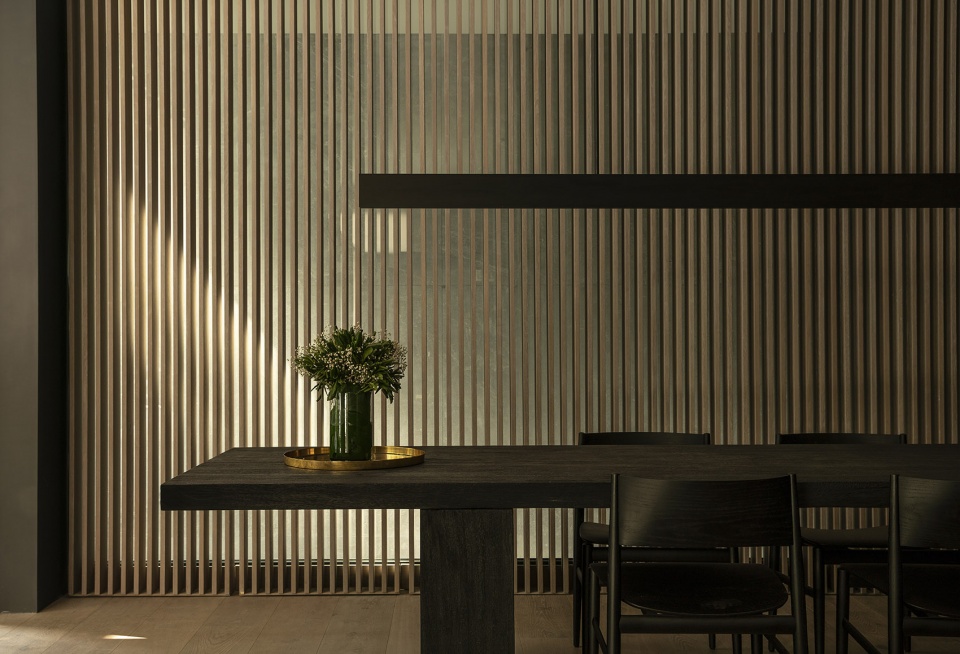 ▼起居室和餐厅通过条形隔墙分隔开来,但仍保持着视觉联系,the living room and dining room are divided by the partition wall made of slats, retaining the visual connection ©David Zarzoso