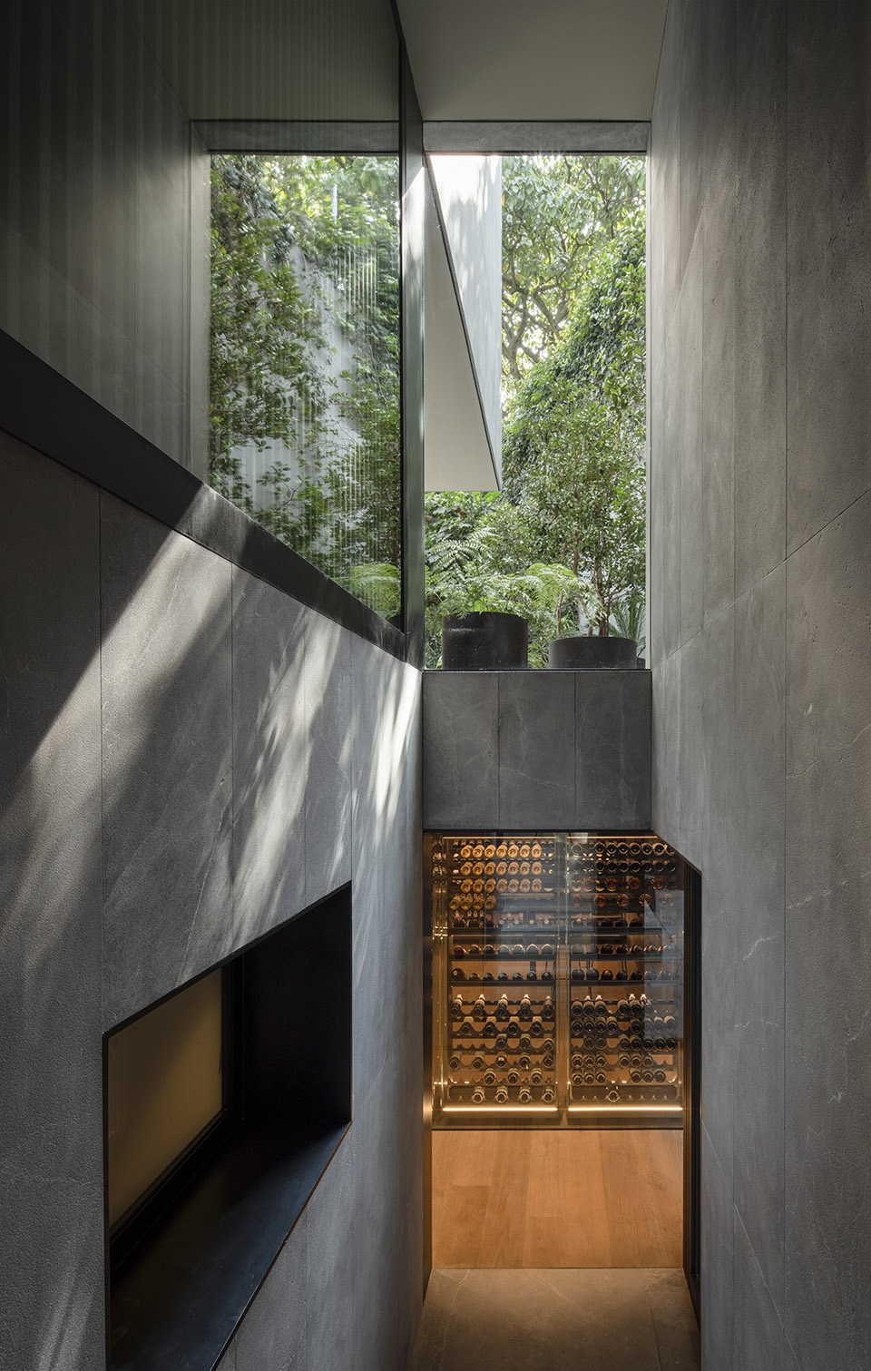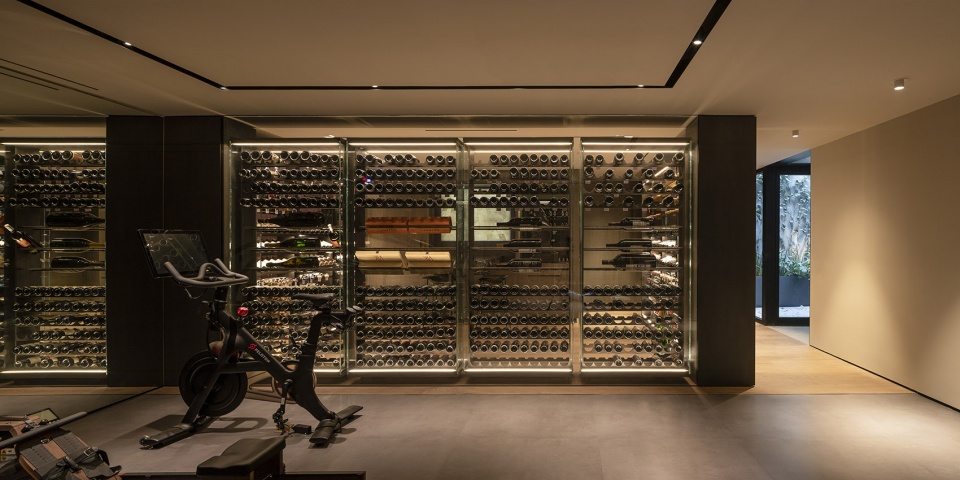 地下室空间内设置着一间酒窖。酒窖的四周布置着展架以方便葡萄酒的展示和储存,内部则设置着一张由黑色大理石打造而成的品酒桌,不仅营造出一种安静而细腻的空间氛围,更与旁边具有视觉联系的健身房和正对着的露台形成了鲜明的对比。