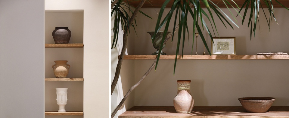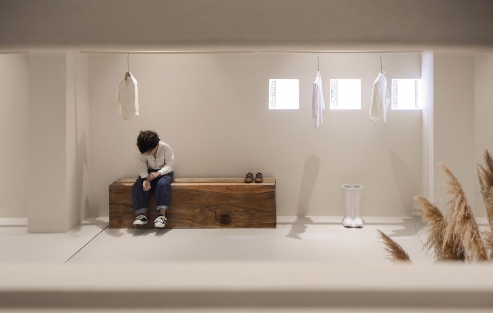 室内的手工木制品、一方白砂石、一字排开的方形窗洞、展架上的陶瓷器皿,无不宣示着回归日常中去,剥离不必要的繁缛装饰,借由艺术设计,将自然引进建筑。人可以通过空间重塑时光的美好与温暖。
