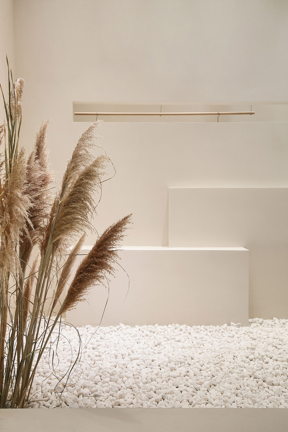 ▼室内局部,白墙与芦苇和和白砂石交相辉映,partial interior view, the white wall, a cluster of reeds and the white sandstone at one side complement each other