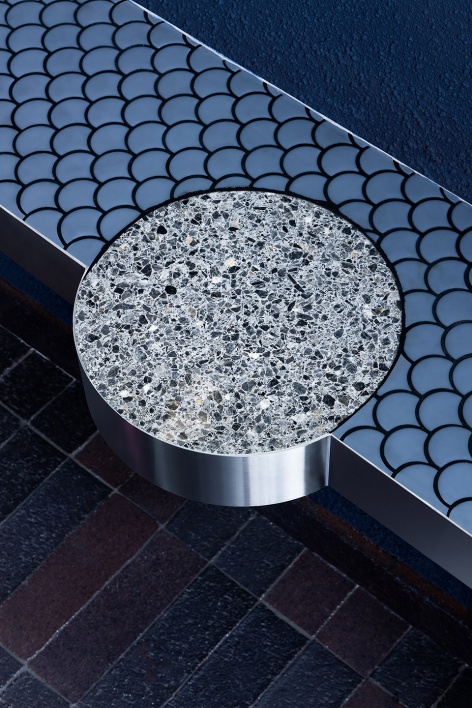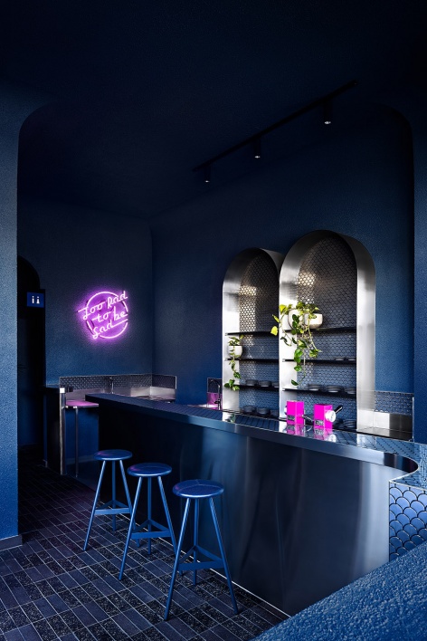 没有什么比钴蓝与粉红色更能代表1980年代了。蓝色——大胆而又情绪化,加之水磨石,马赛克砖,打磨墙面与布艺内饰的材料纹理与质感,给单一的色调带来具有深度的丰富变化。地面铺设了地板砖,而不锈钢吧台和拱形置物柜则彰显了复古的情调。玫粉色和霓虹灯不仅为空间增色不少,同时起到了吸引顾客的效果。