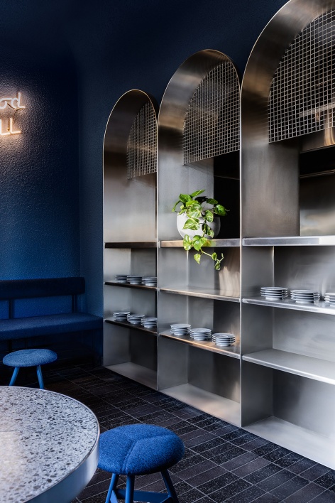 Nothing says 1980s like a palette of cobalt blue and hot pink. Blue is bold and moody, with textural materials – terrazzo, mosaic tiles, rendered walls and felt upholstery – to create depth, richness and variation within the singular hue. Brick flooring grounds the space, while the stainless-steel bar and arched shelving has old-school counter vibes. Hot pink and neon punch up the palette and help get customers into the groove.