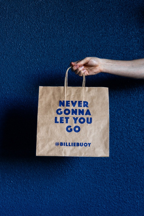 We developed the brand identity, including the signage, coffee cups, packaging and apparel, inspired by the bright, colourful designs of Memphis. Rick Astley’s catchy lyrics are printed on the takeaway bags, and a Billie Buoy play on the Billionaire Boys Club is on the branded apparel.