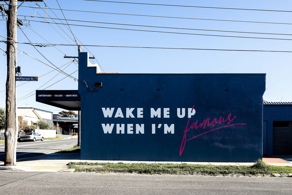 Occupying a corner location, the building has strong street presence to the front and side. Glass windows provide a view into the front of the venue, while the side wall is splashed with “Wake Me Up When I’m Famous,” providing a memorable backdrop for Instagram fame.