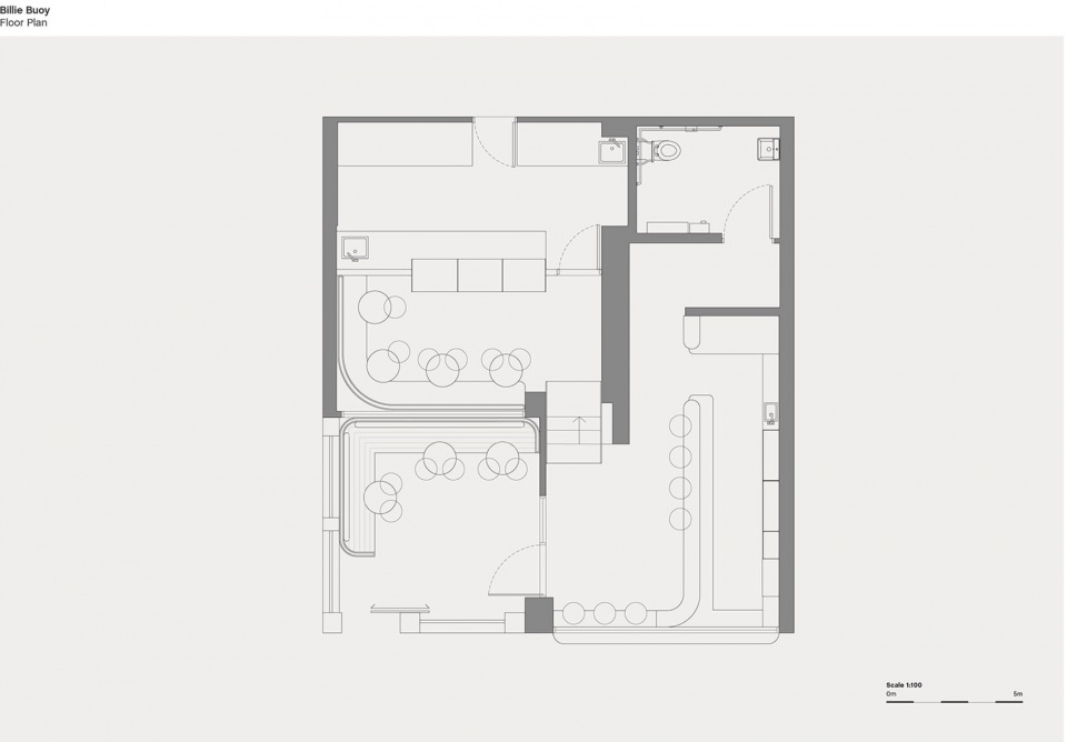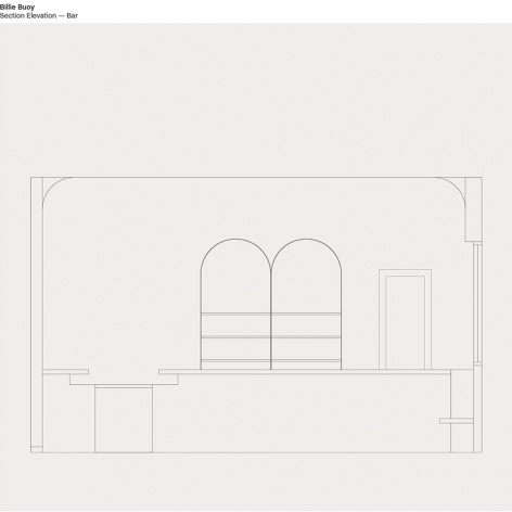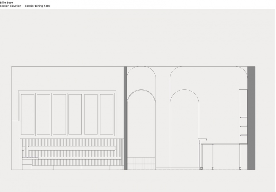 在这60平方米的内部空间里,每一厘米都被充分利用了起来。在某种程度上,它被设计成一个小餐厅,玄关处设置了转角沙发,紧接着是带有高脚凳的吧台区,为进出流线提供了周转的空间。经过拱形的通道后,是设有卡座沙发的后部餐厅区和后院。拱形是Billie Buoy一个重要的元素,天花板的边缘为了契合拱形元素而降低,柔化了天花板与墙面的界限。