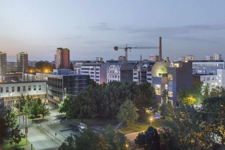 Breaking with the Berlin tradition of closed blocks with continuous roof lines, the ensemble consists of two buildings grouped around a public courtyard. Public space expands onto the plot, a large light installation entices passers-by into the courtyard where changing installations from the owners art collection provide unexpected encounters.