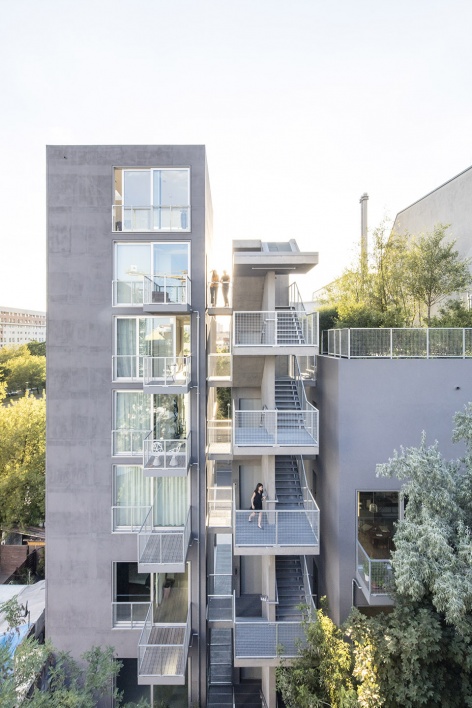 The building concept is driven by our ongoing research into typologies of residential design. The complex has characteristics of free -standing suburban buildings, the typical Berlin tenement block as well as referencing the french “hotel particulier”. All are translated and compressed into a dense urban context, where they explore the boundaries between the public and the private, the social and the intimate.
