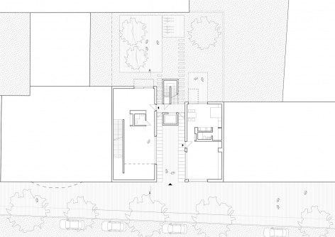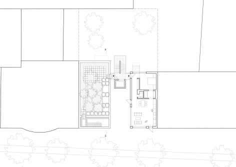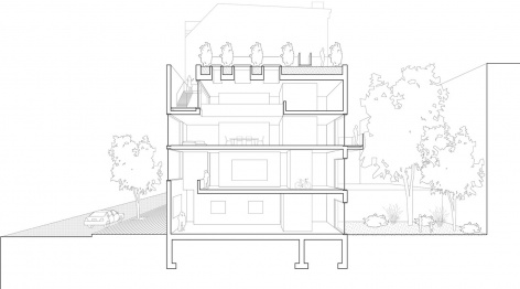 The concept of “entre court et jardin”, originally used to describe the complex relationships of public and private spaces in french “hotels particuliers”, is referenced again in the spatial arrangement of the collectors house: The counterpart of the public “court” on the street level is the private garden located on the roof, with the living spaces in between. From the living spaces, directed views connect to both formal and informal outdoor spaces of different degrees of privacy.